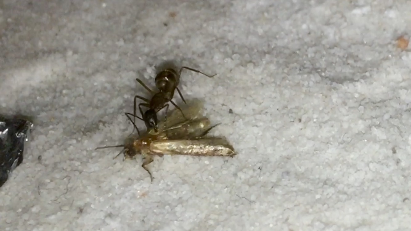 Nachdem ich das geöffnete Reagenzglas in die Arena gelegt habe, sind sofort vier Arbeiterinnen auf Erkundungstour gegangen, und haben sich mit Honigwasser vollgepumpt. Einige frisch tote Fruchtfliegen, die ich angeboten habe, wurden ignoriert.