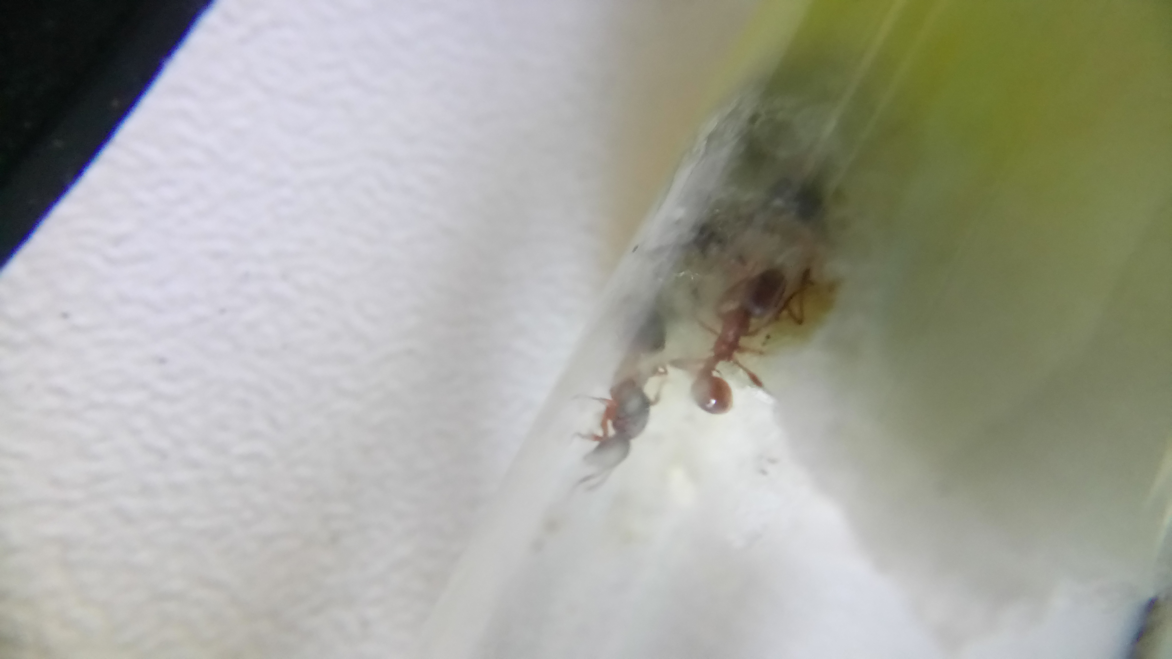 Auch nach Wochen wollten sie das Reagenzglas nicht verlassen, erst als der Tank leer war, wurde ein neues akzeptiert. Die zwei kurzzeitig vorhandenen Arbeiterinnen sind verstorben, bald darauf dieGyne . Auch hier fand ich massenhaft Milben im Reagenzglas vor.