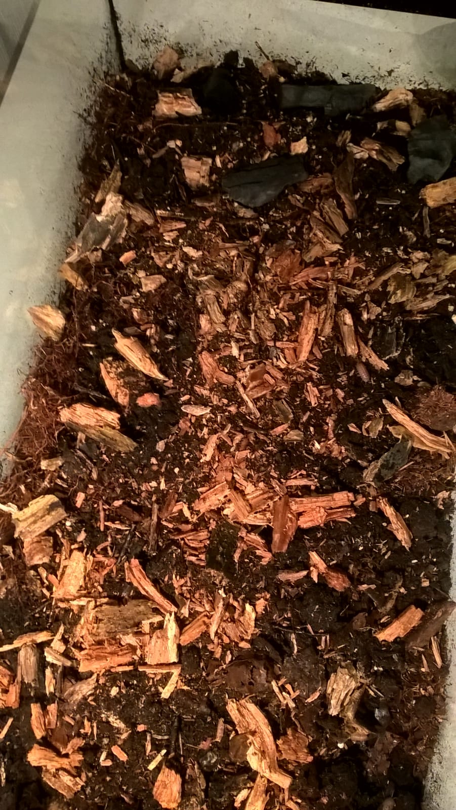 Darauf kommt dann wieder eine Schicht Walderde mit Holzkohle und Kalkgranulat: