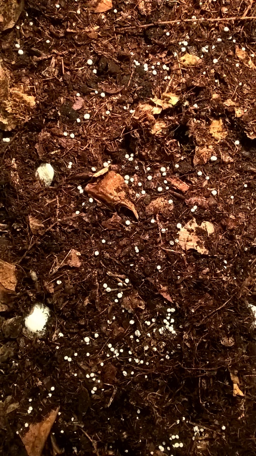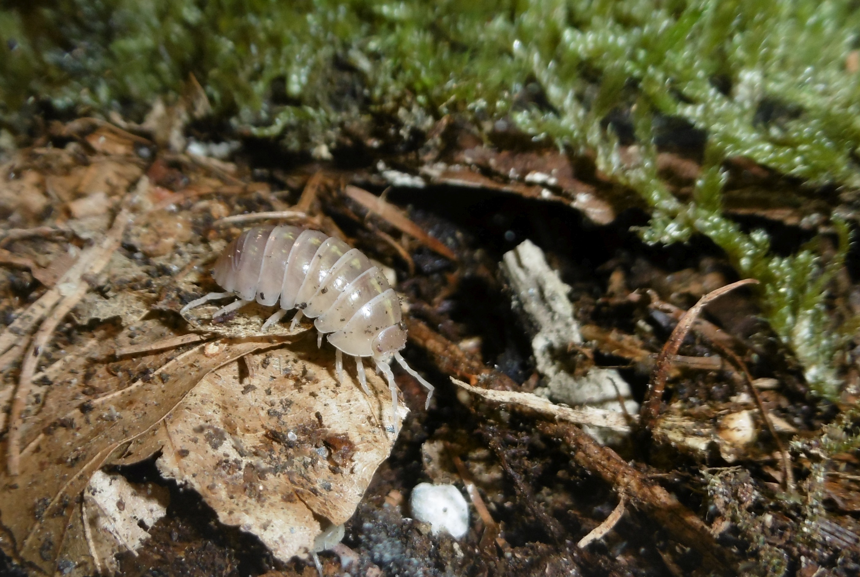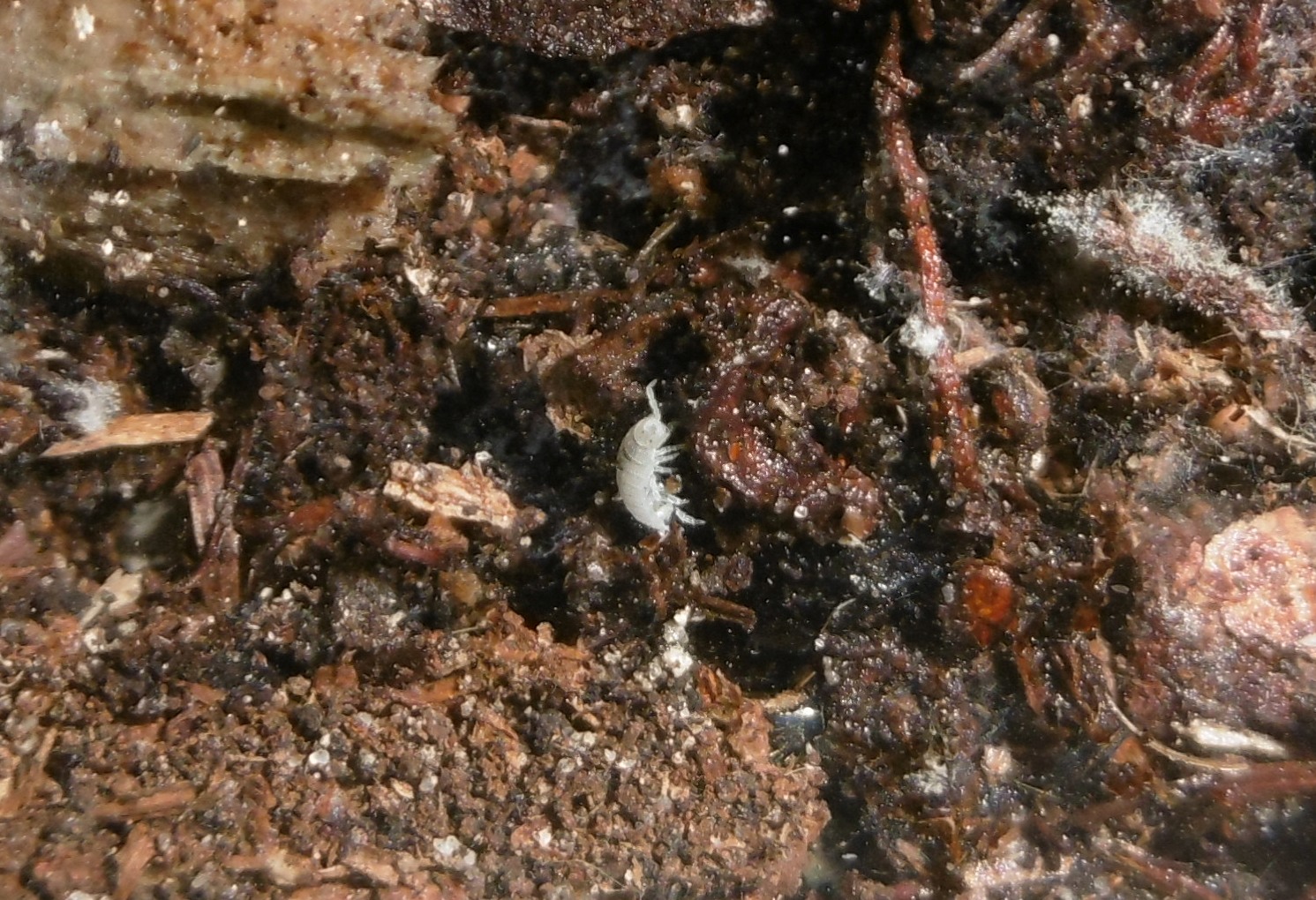 Die Bodenpolizei wird eingesetzt. In der Erde befinden sich weiße Asseln, Springschwänze und Albino-Rollasseln: