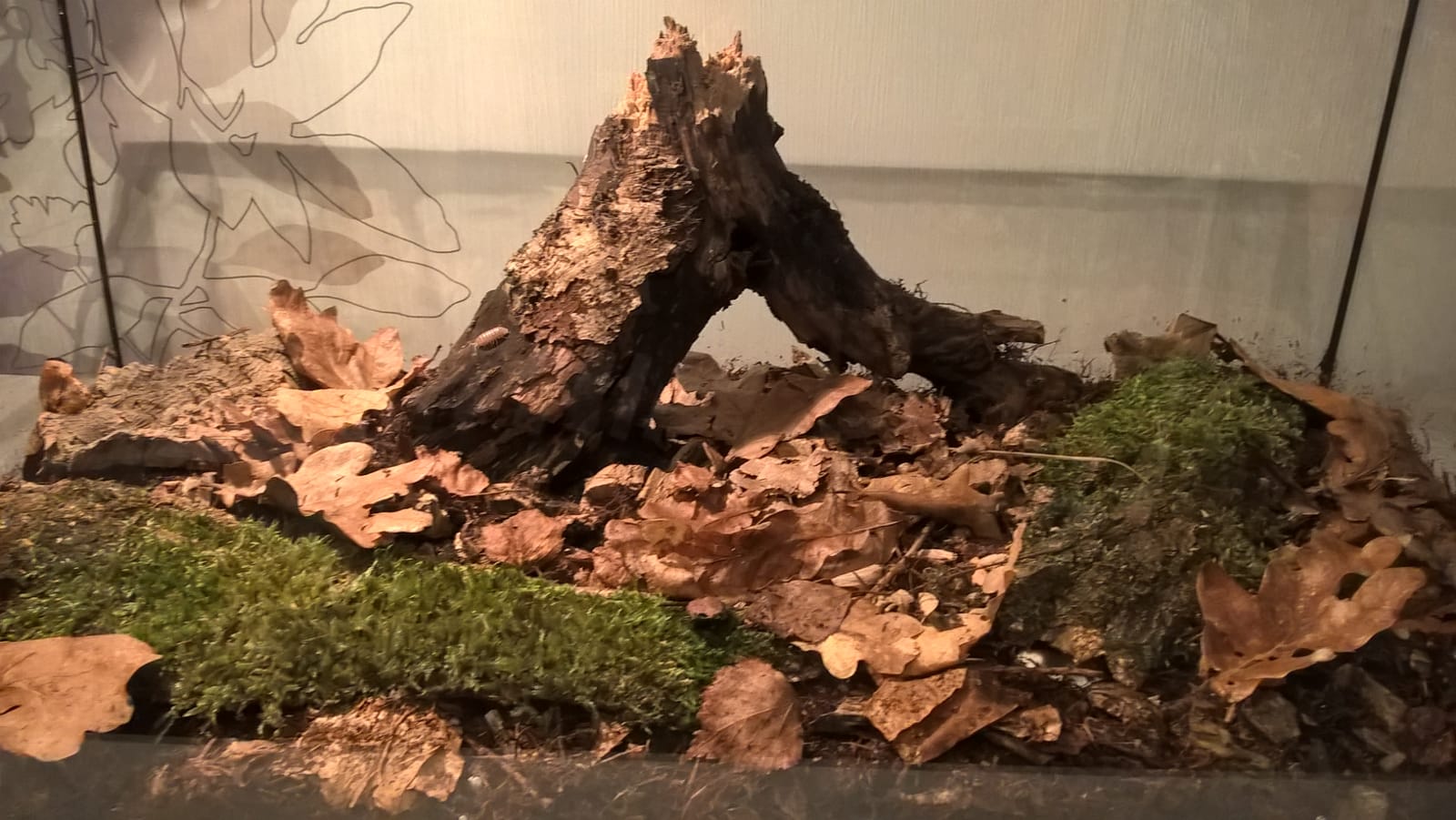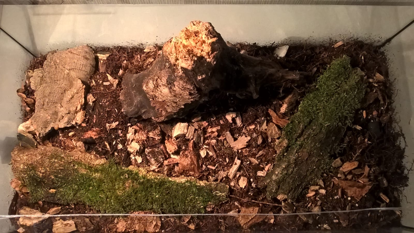 Zwei moosbewachsene Rindenstücke wurden platziert, ebenso ein Stück Korkrinde aus dem Zoohandel. In der Mitte des Bildes das Ast- bzw. Wurzelstück, das als Landmarke dienen soll: