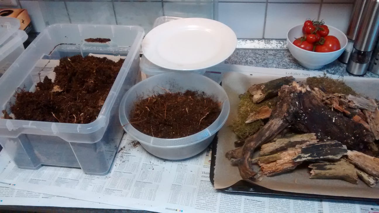 Gesammelt haben wir Walderde, weißfaules Holz, Eichenlaub, moosbewachsene Rindenstücke und ein größeres Holzstück als Landmarke.