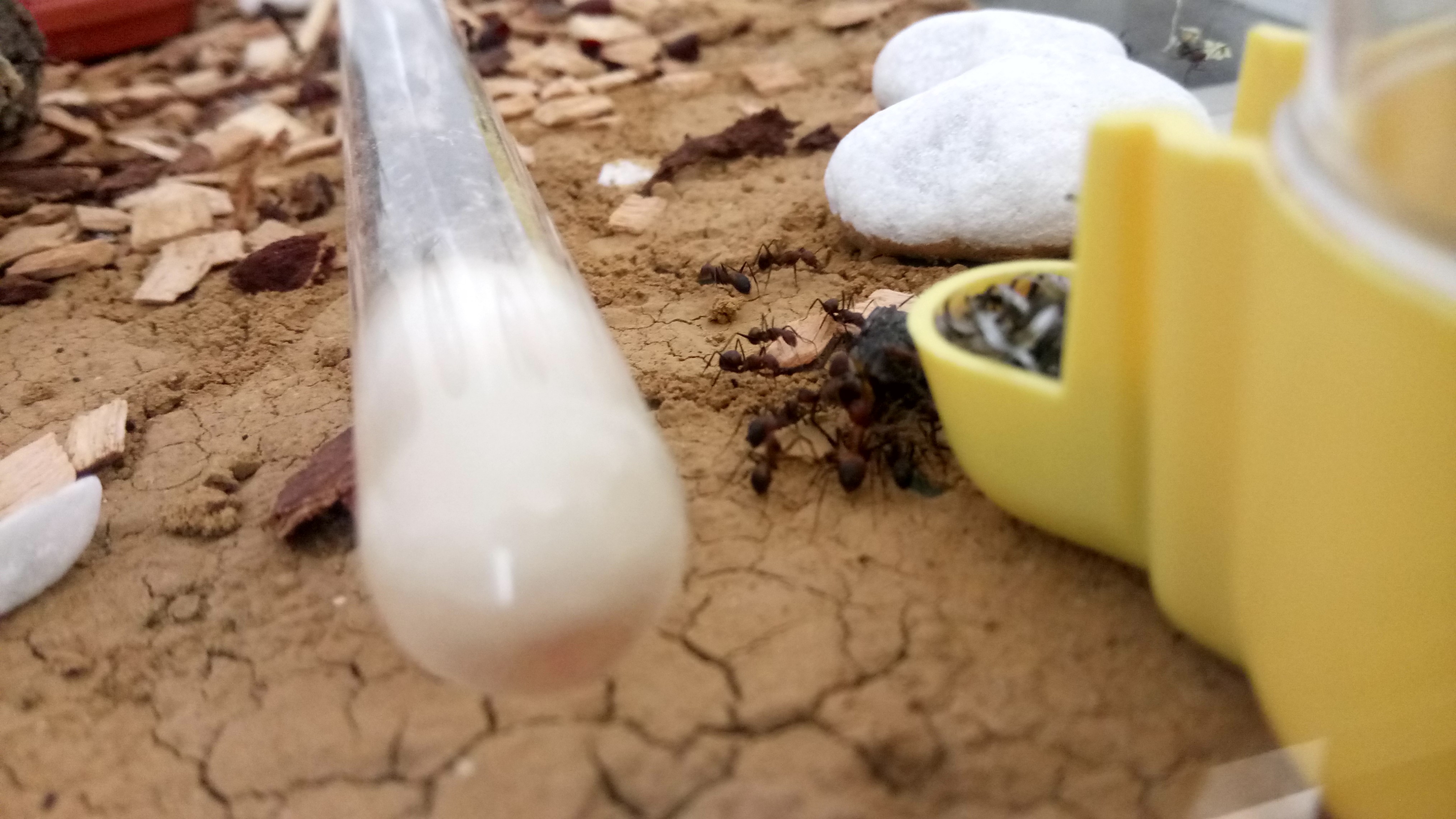Das Nest befeuchte ich vielleicht einmal in der Woche. Temperatur im Nest liegt bei ca. 28°C, in der Arena bei 25°C. Die Fütterungen habe ich etwas erhöht, 1-4 Fliegen oder Fliegenpuppen pro Woche, ich halte es eher unregelmäßig. Ansonsten gibt es zwei RGs, eines mit Wassertank und eines mit Zuckerwasser.