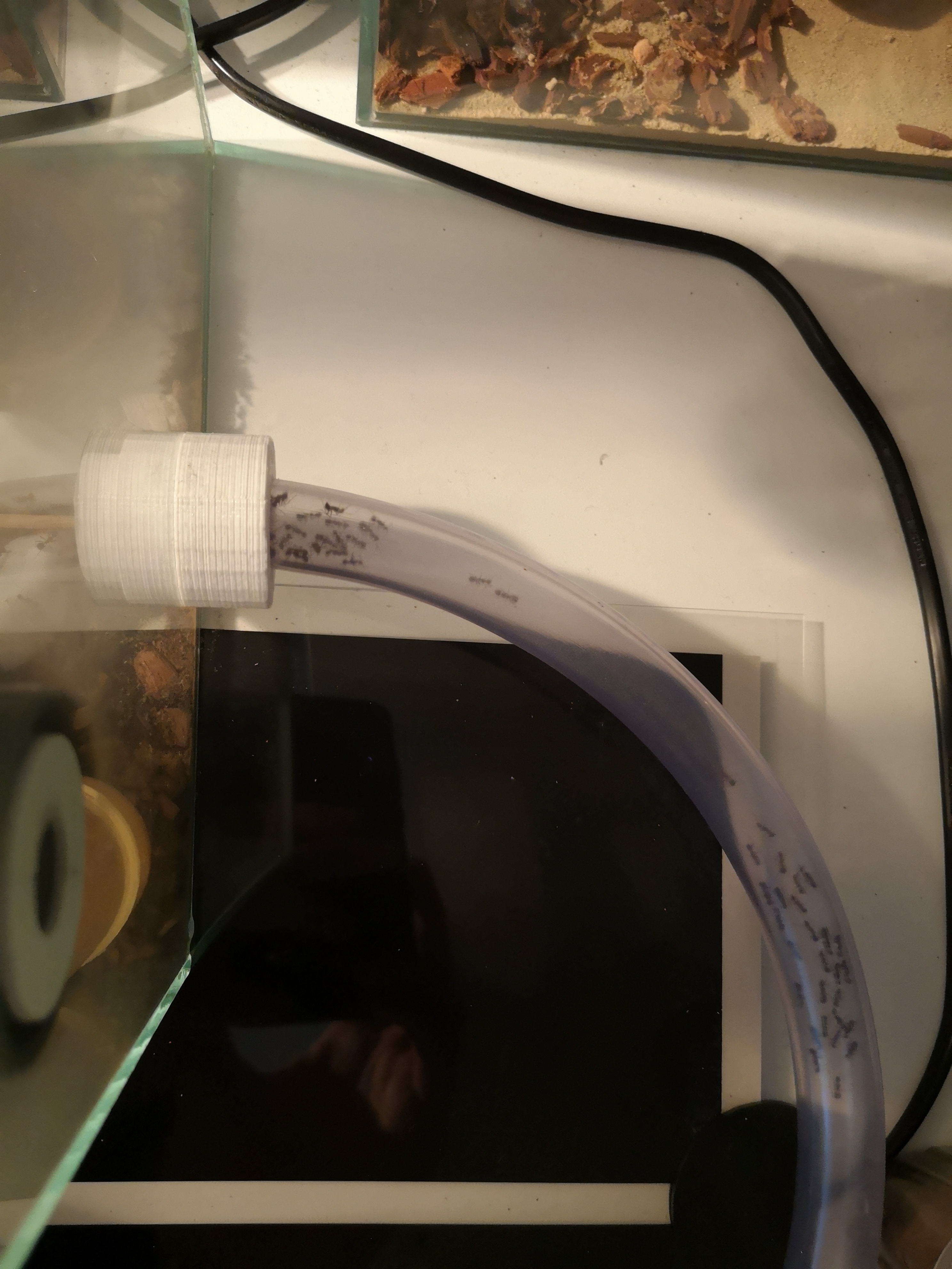 Nächstes Projekt für diese Kolonie, ist eine Verbesserung des Ausbruchsschutzes. Ausbrüche gelingen momentan zwar nicht, doch sitzen immer mal wieder Arbeiterinnen am Deckel. Plan ist, die Arena mit einem Rahmen auszustatten, welcher mit einem PTFE Lack versehen wird.