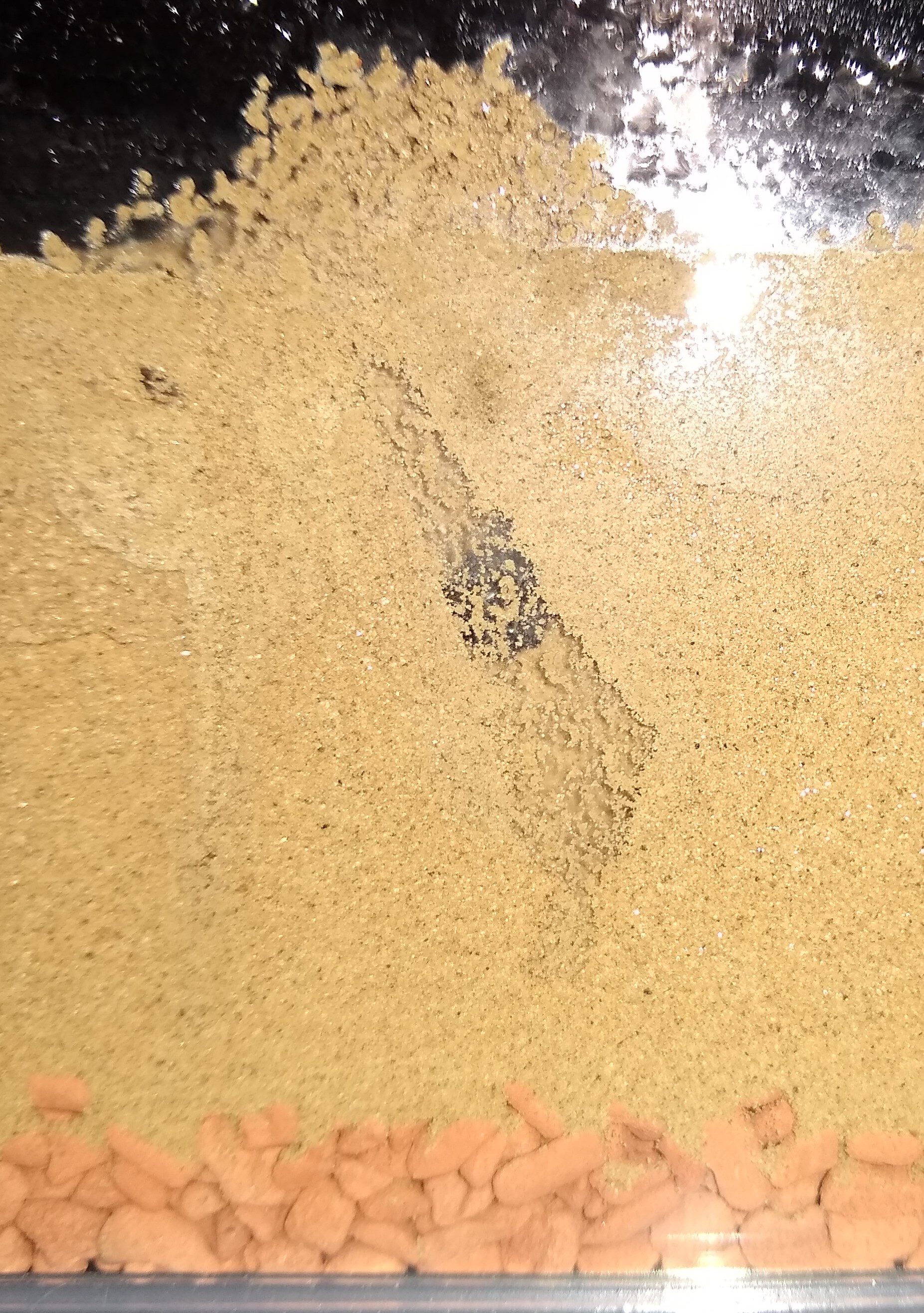 Die Farm ist noch recht neu und somit feucht, steht über einer Heizung auf einem Steinregal und wird somit von unten beheizt. Am Anfang hatte ich an einem Anschluss der Farm ein neu beschafftes Reagenzglas zum Umzug angeboten, was aber nicht angenommen wurde. Dieses habe ich nach ein paar Tagen in die Arena gelegt und biete nun alle paar Tage über den Anschluss der Farm diverses Futter (Protein, Insekten, Honig, Zuckerwasser etc.) an, was nach meiner Kenntnis bis heute nicht weiter angerührt/eingetragen wurde.