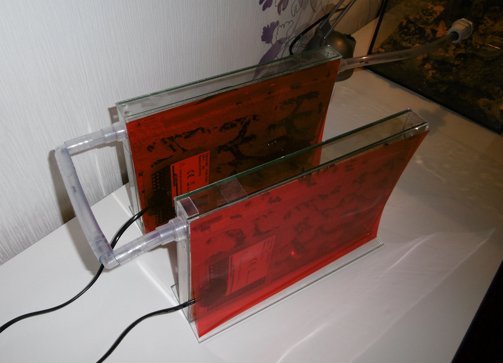 Zunächst habe ich zwei 27mm Bohrungen in das Glas geschliffen, für die Schlauchanschlüsse. Dabei bin ich streng nach dem sehr guten Tutorial von ReliAnt vorgegangen, welches ihr hier findet: