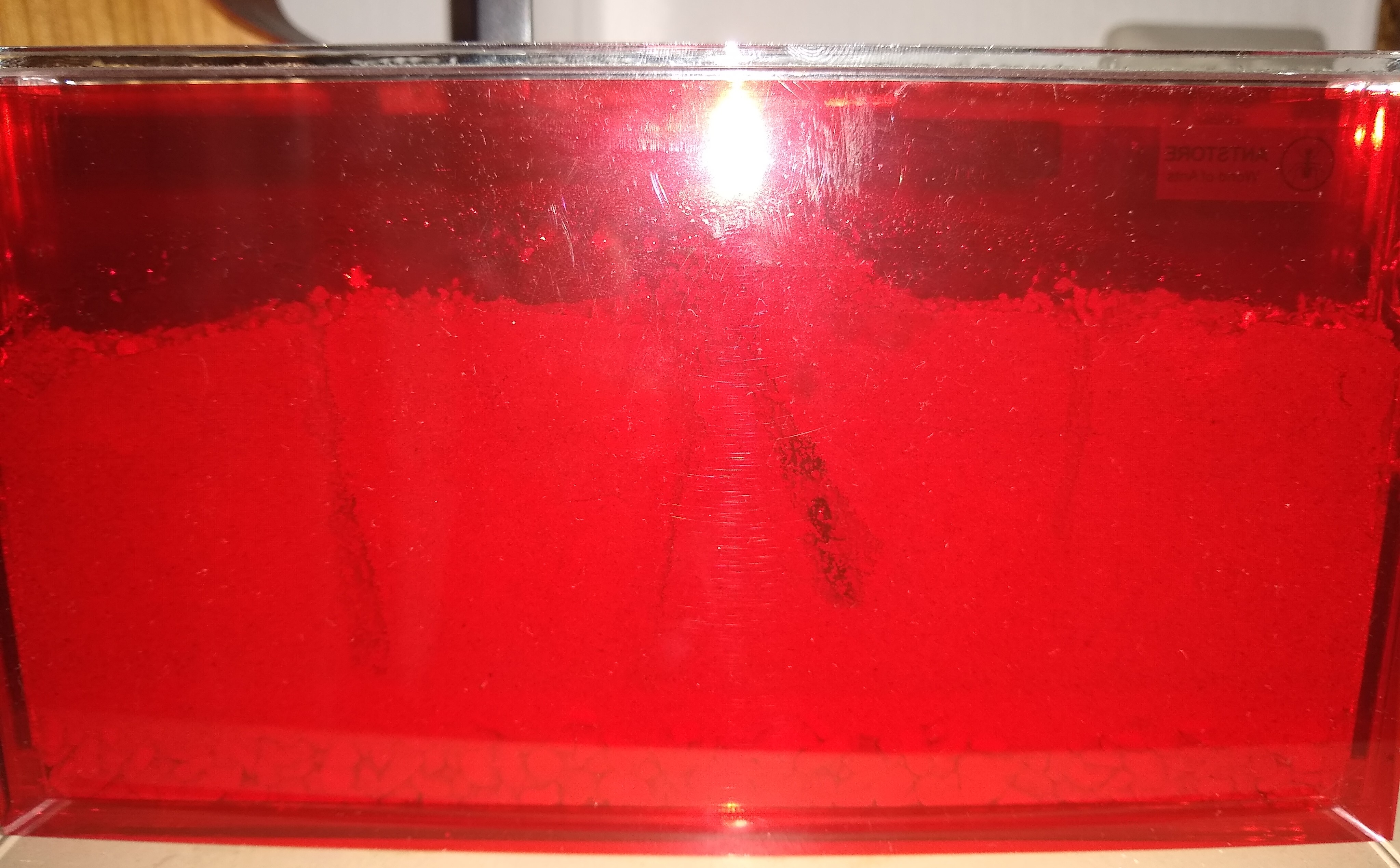 Das neue Reagenzglasnest liegt nun in der Arena, welche über einen ca. 20 cm Schlauch mit der Farm verbunden ist und auch auf besagtem Regal steht. In der Arena biete ich auch Wasser, Honig und Zuckerwasser an.