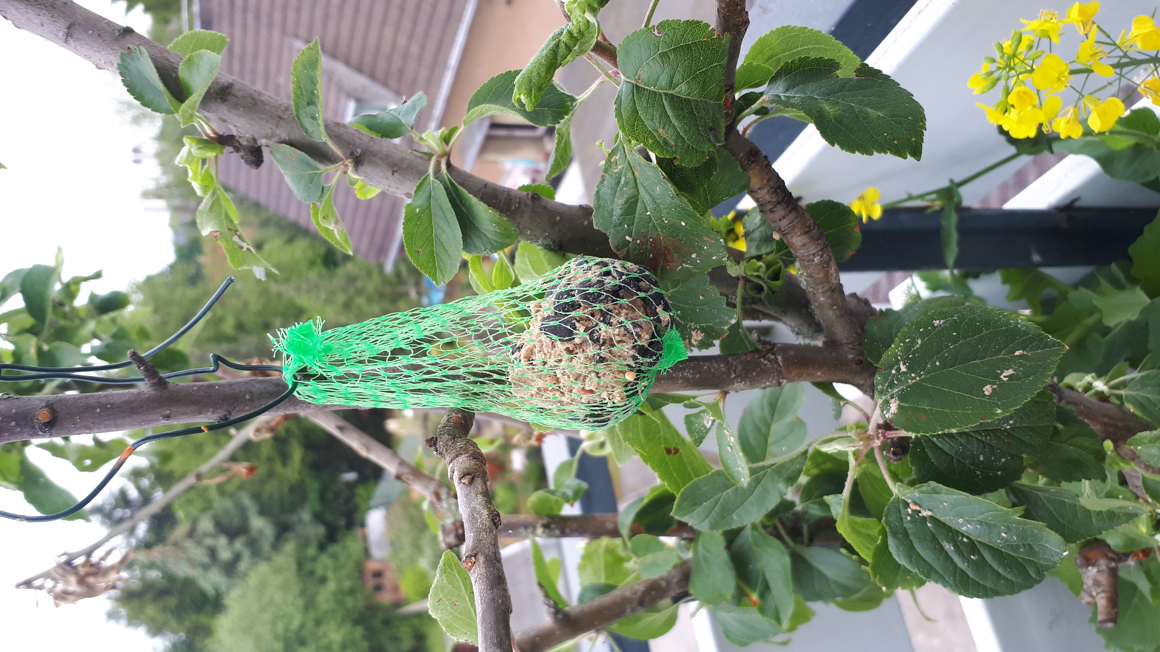 Meine Oma verschenkt gern Meisenknödel. Ständig. Reichlich. Nun habe ich mich dazu überreden lassen, wenigstens einen mal aufzuhängen. Im Mai. Na schön. Schadet ja nicht.