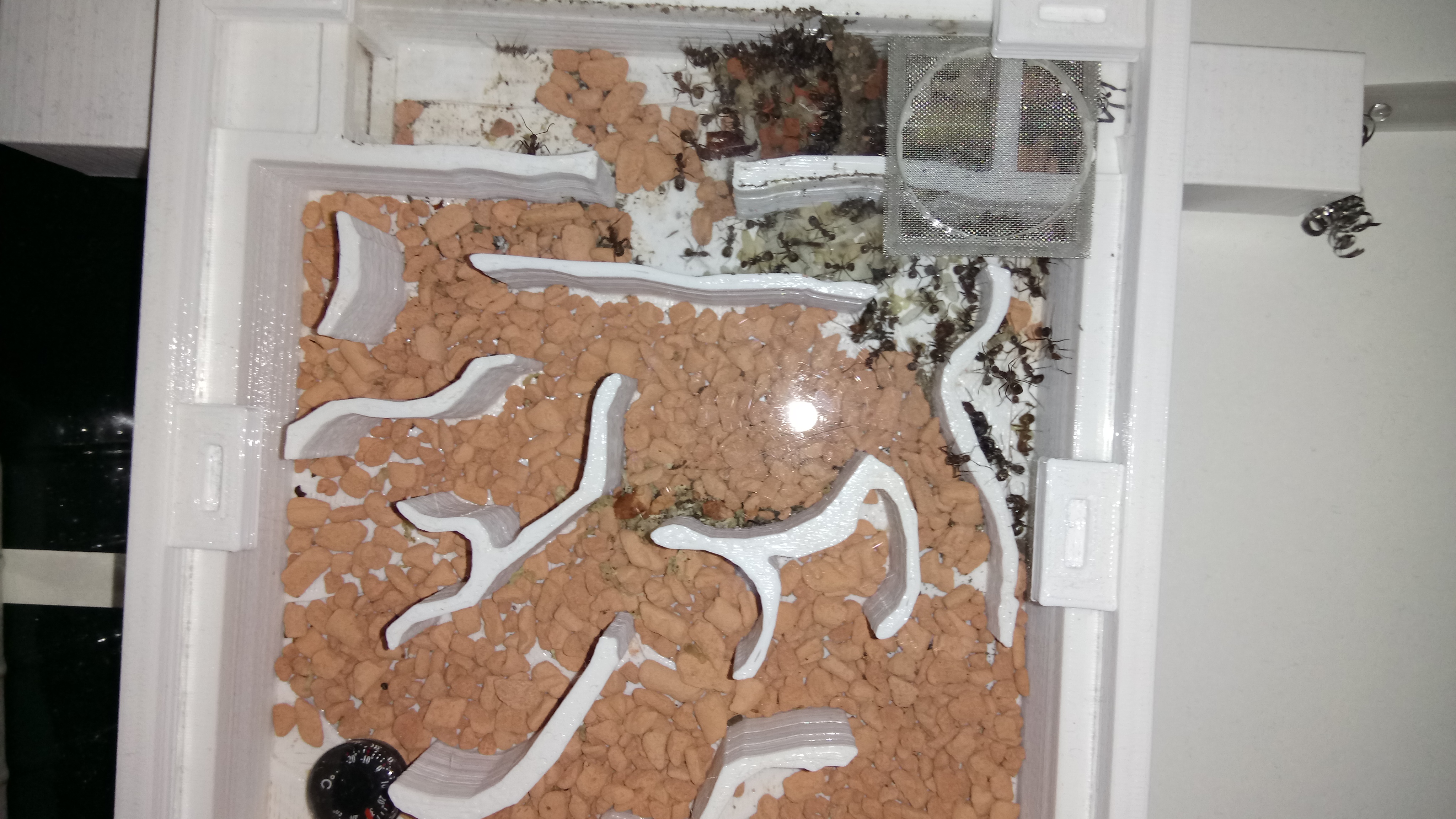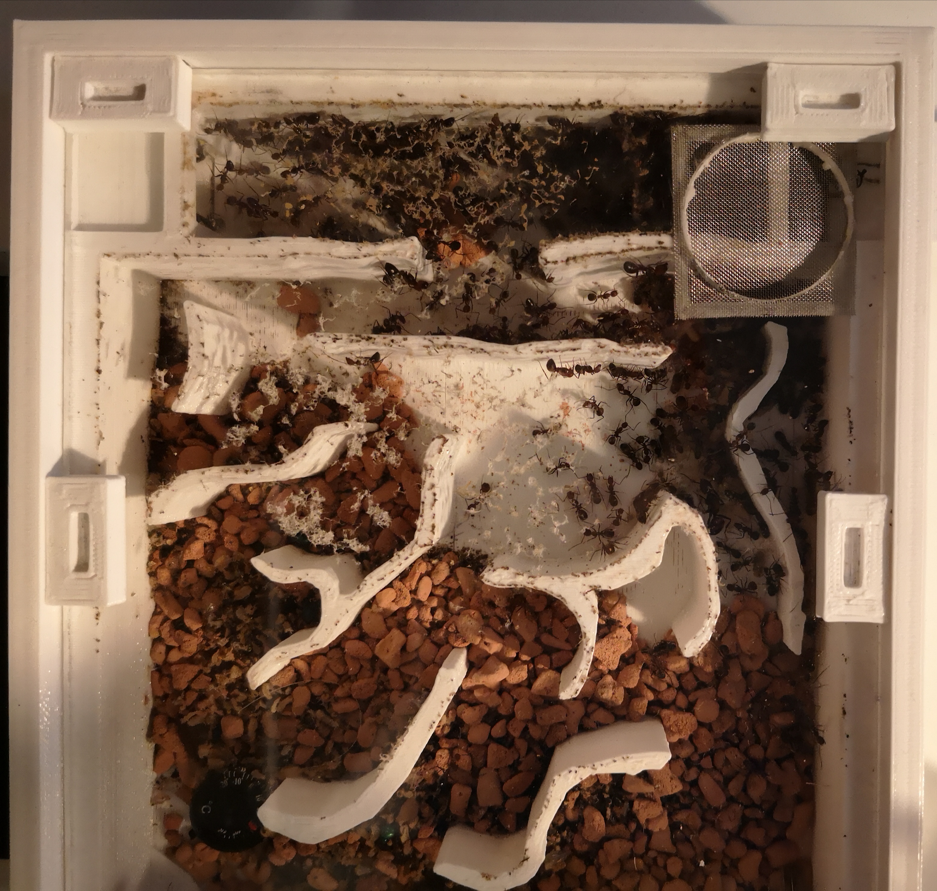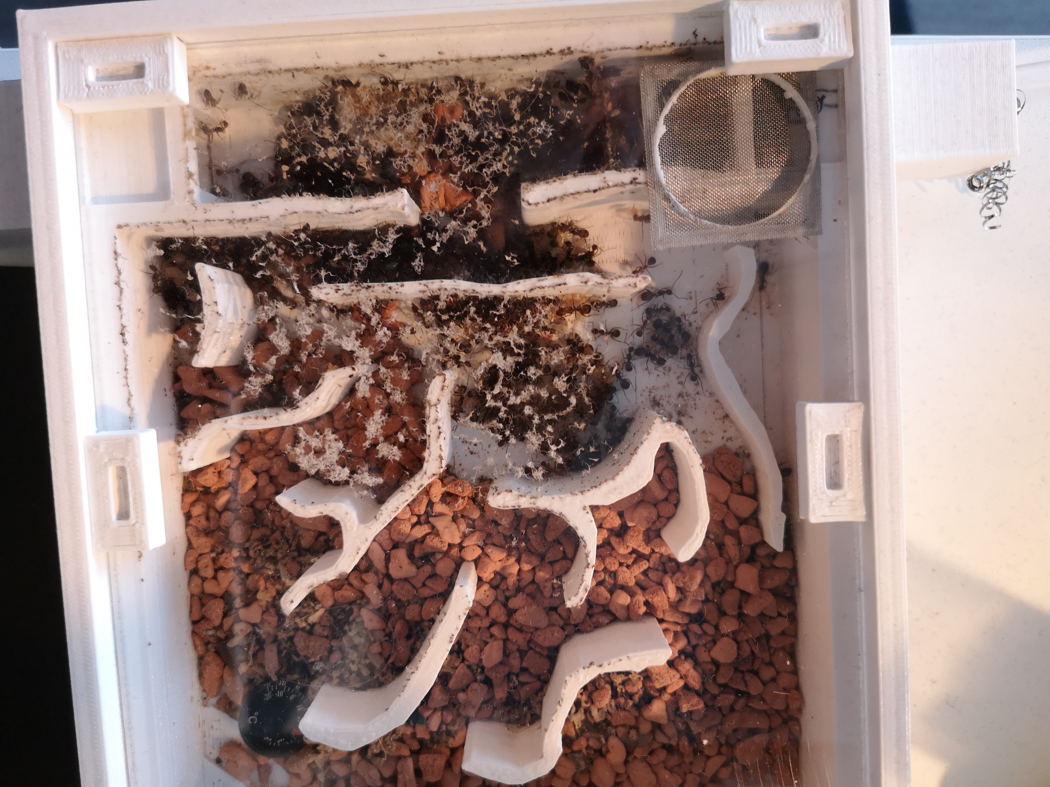 Nächstes Projekt für diese Kolonie, ist eine Verbesserung des Ausbruchsschutzes. Ausbrüche gelingen momentan zwar nicht, doch sitzen immer mal wieder Arbeiterinnen am Deckel. Plan ist, die Arena mit einem Rahmen auszustatten, welcher mit einem PTFE Lack versehen wird.