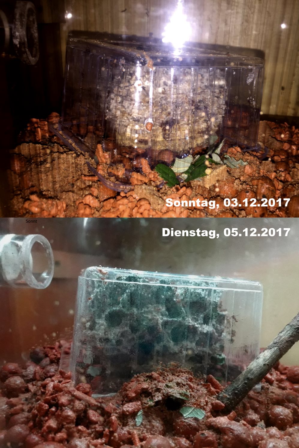 In ersten Tagen waren die Ameisen sehr fleiĂźig und man konnte dem Pilz beim Wachsen zusehen. Zwischen den beiden Bildern liegen 2,5 bis 3 Tage.