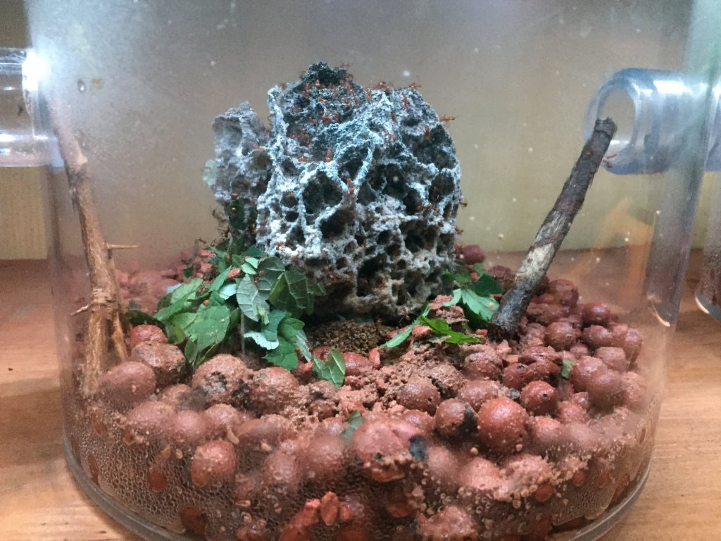 Wunder geschehen immer wieder: ca. in Q2 von 2018 ging es dann bergauf, immer weiter bergauf, der Pilz wuchs und wuchs, die Ameisen wurden mehr und vor allem zahlenmäßig deutlich mehr als die Springschwänze. Ich habe zwar immer noch Springschwänze in der Anlage, aber überschaubar wenige.