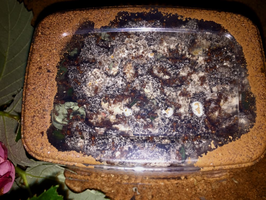 Wunder geschehen immer wieder: ca. in Q2 von 2018 ging es dann bergauf, immer weiter bergauf, der Pilz wuchs und wuchs, die Ameisen wurden mehr und vor allem zahlenmäßig deutlich mehr als die Springschwänze. Ich habe zwar immer noch Springschwänze in der Anlage, aber überschaubar wenige.