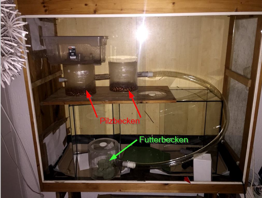 Bis die ersten Becken der eigentliche Anlage fertig sind kommen sie in eine kleine Übergangsanlage mit 3 Zylindern. Zwei für Pilze und ein Futterbecken. Sobald die Kolonie etwas größer ist, werde ich noch ein Abfallbecken anschließen. Die drei Zylinder stehen in einem großem Holzterrarium in dem ich eine 10 W Heizmatter liegt so dass die Temperatur in dem Terrarium jetzt im Winter bei 21 bis 22,5°C liegt.
