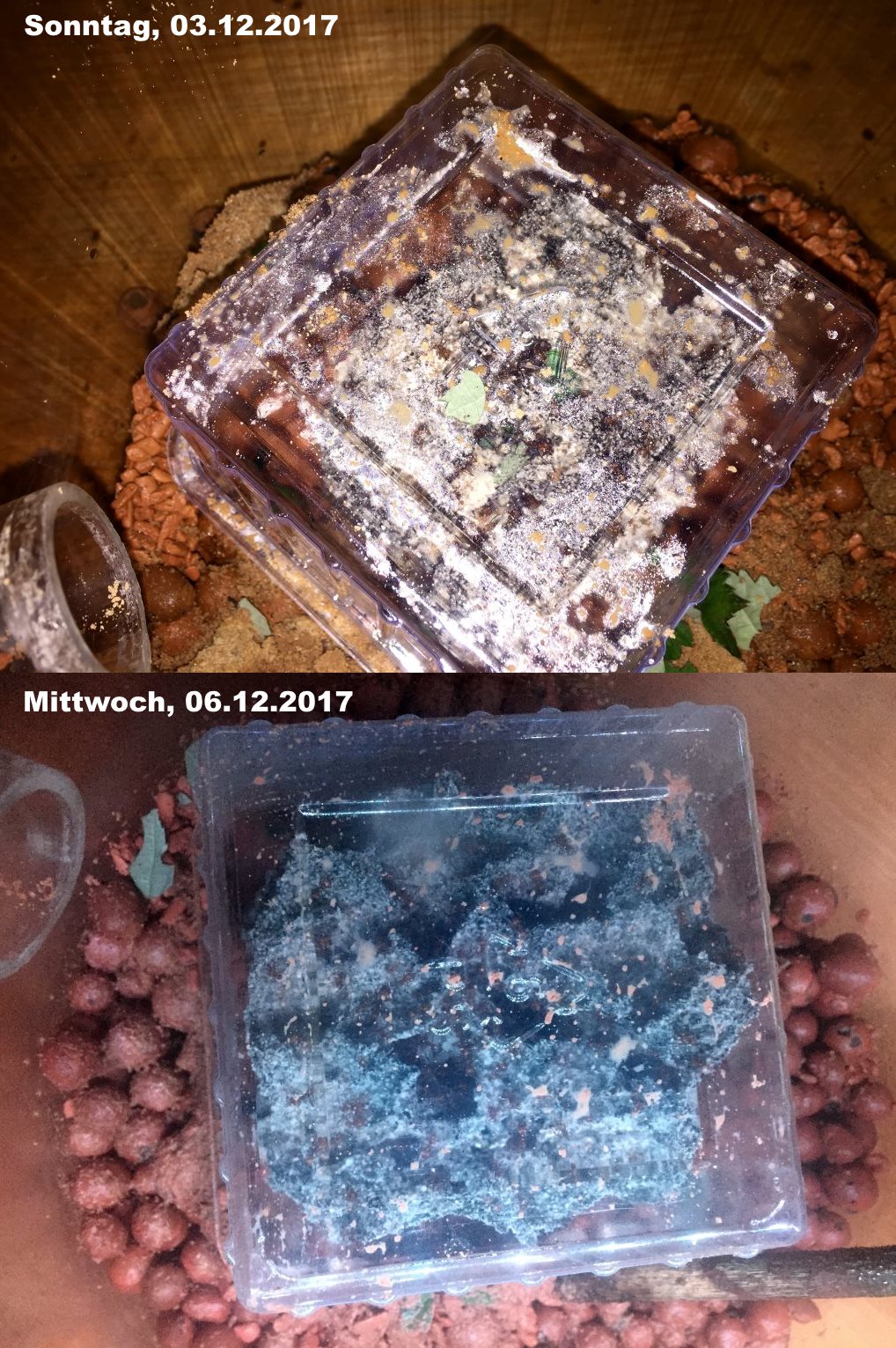 In ersten Tagen waren die Ameisen sehr fleiĂźig und man konnte dem Pilz beim Wachsen zusehen. Zwischen den beiden Bildern liegen 2,5 bis 3 Tage.