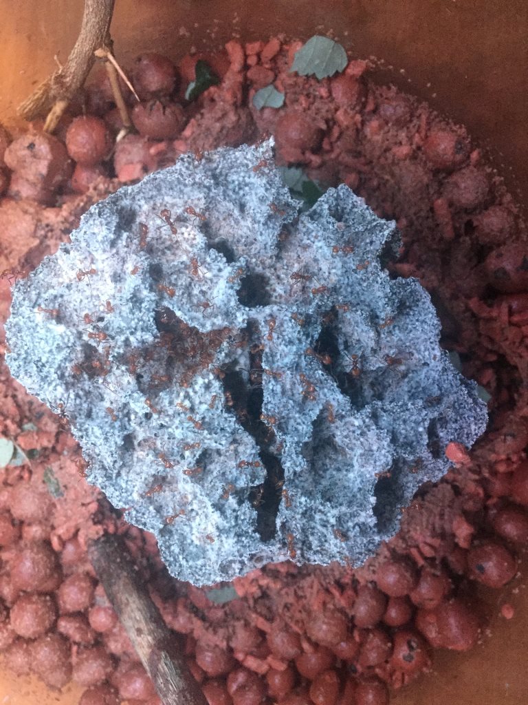 Inzwischen ist es eine tolle und sehr aktive Kolonie geworden. Sie haben in zwei Becken ihre Pilzgärten. Eines ist randvoll, das zweite wird immer voller und dürfte zeitnah ebenfalls nicht mehr ausreichen. Insgesamt dürften es derzeit ca. 35 Liter Pilzvolumen sein (evtl. sind es auch schon 40 l) und ich bin dabei die nächsten beiden Pilzbecken zu bauen…