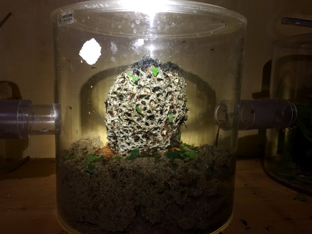 Kleiner Zeitsprung zum letzten Post, wo ich in der Zwischenzeit wenig dokumentiert hatte bzw. die Bilder dazu nicht mehr finde. Soweit ich es in Erinnerung habe, hatte der Pilz wieder angefangen abzubauen. Ich hatte es u.a. auf die hohen Temperaturen im Sommer im Wohnzimmer zurückgeführt, weswegen ich die Ameisen in den kühleren Keller gestellt hatte.