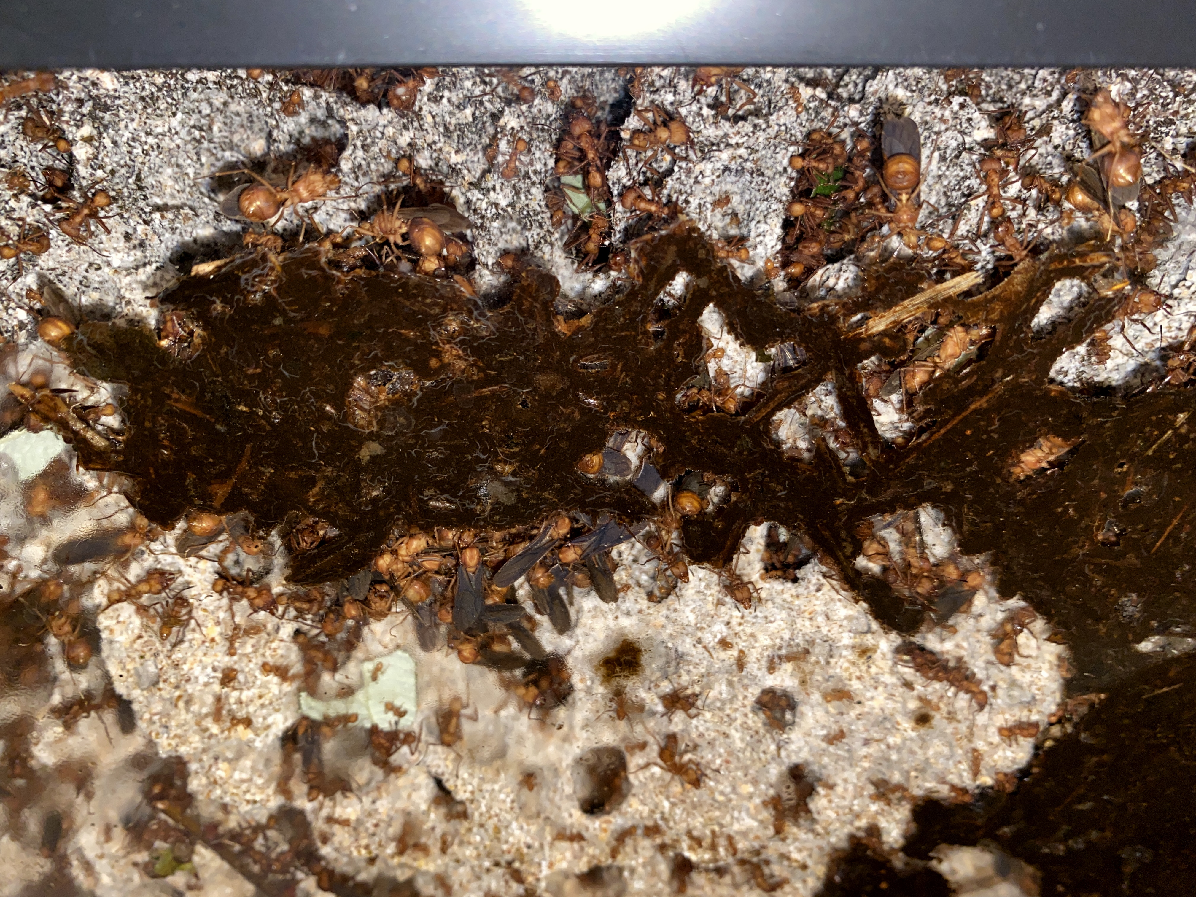 Da war ein "Freilaufast" aus der Kolonie, der direkt ĂĽber einem Eimer geendet ist. Die Ameisen sind den Ast mit dem MĂĽll runter und haben ihn am Ende weggekickt, wodurch er im Eimer gelandet ist!