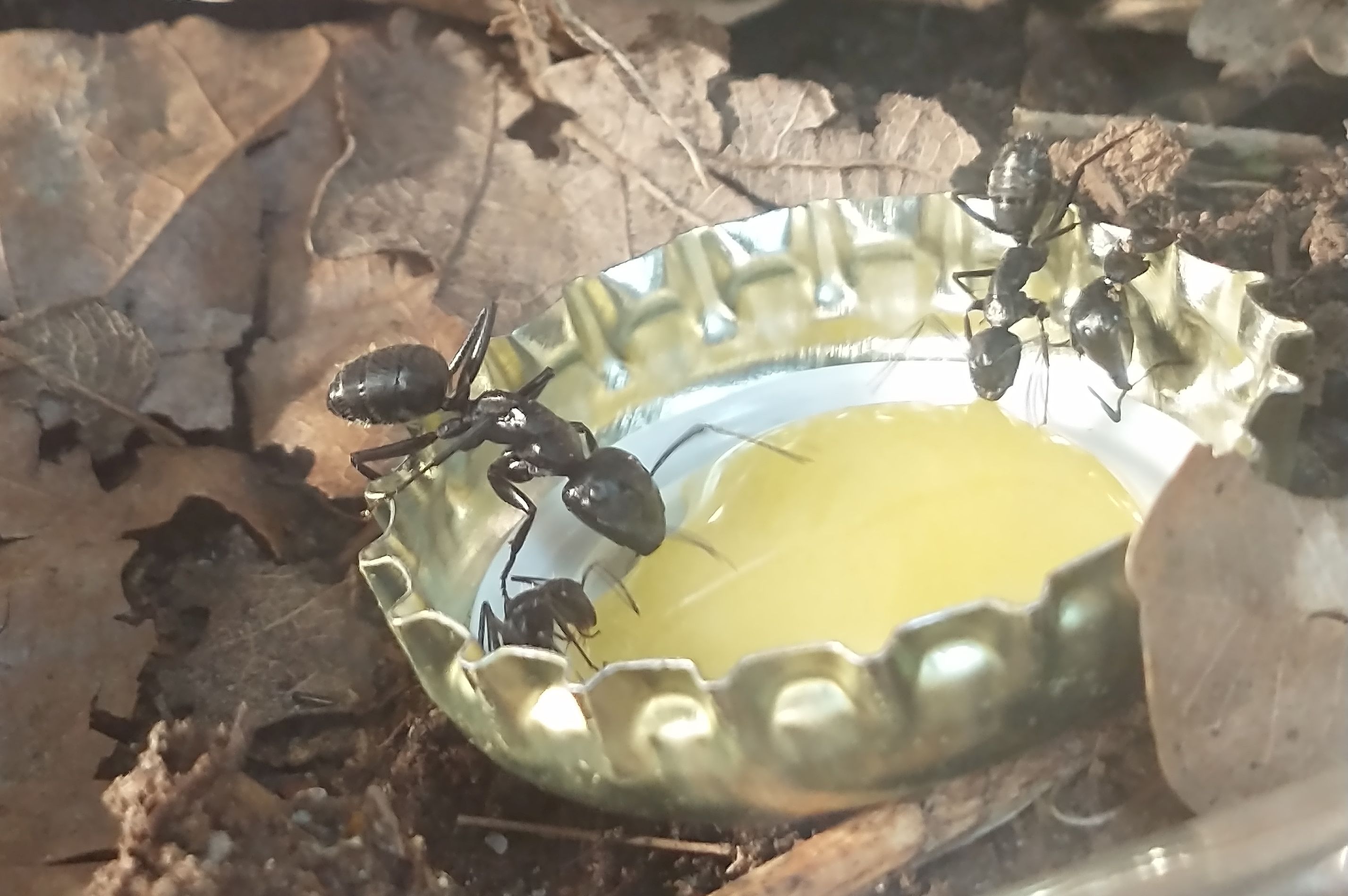 Ansonsten habe ich heute reichlich Futternäpfe mit Honig in der Arena verteilt und auch das erste Mal diese Saison etwas Insektenfutter angeboten:
