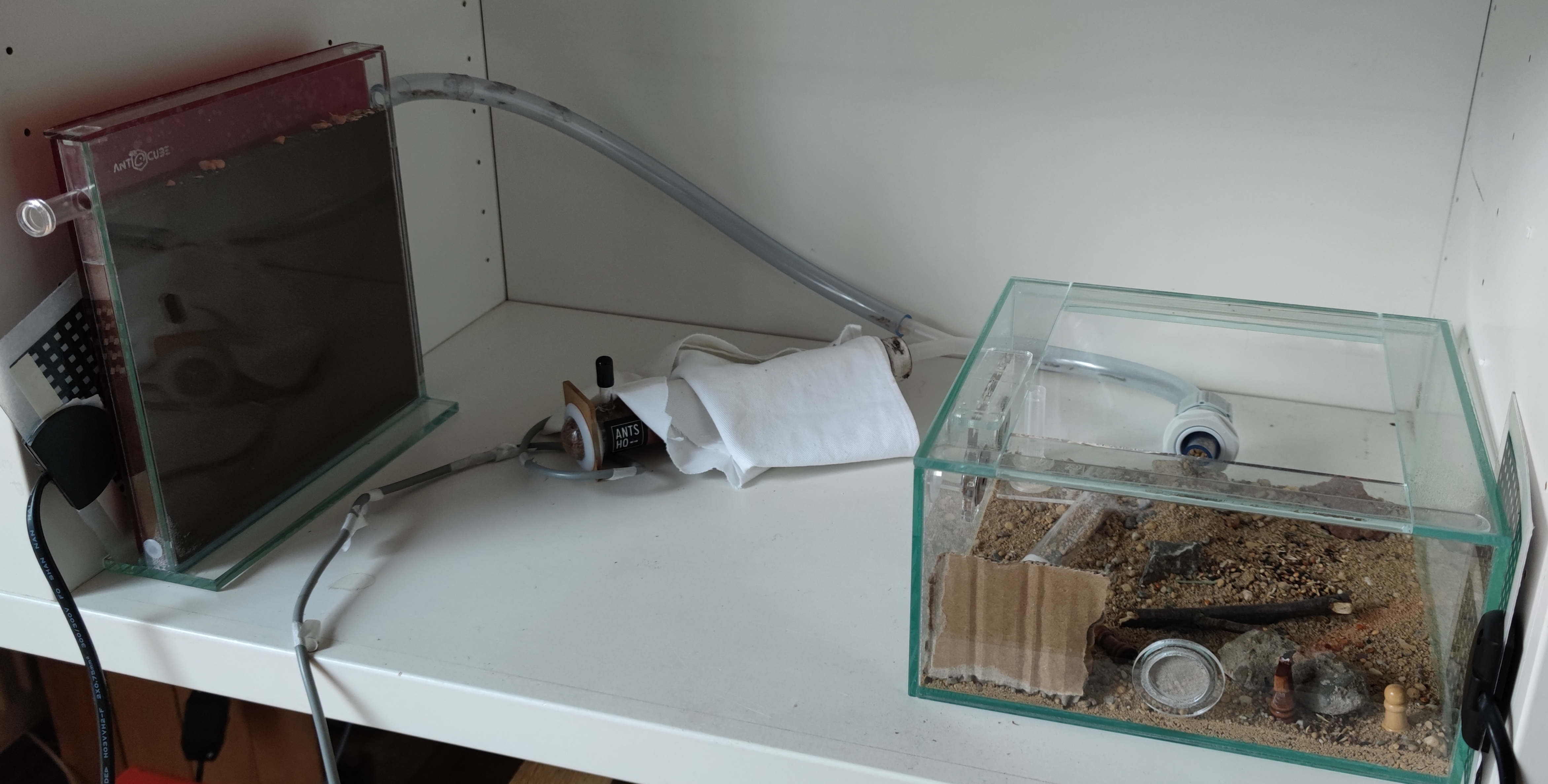 Seitdem Umzug ist einiges los. Sowohl die beheizte Farm als auch der Schlauch werden als Teil des Nestes angesehen. Der Schlauchadapter der Arena ist der Nesteingang, und dementsprechend mit Sand-Lehm Mischung verbarrikadiert. Das alte Reagenzglas lasse ich noch als TrÀnke in der Arena liegen. Vereinzelt sehe ich Mal eine Arbeiterin darin rumhÀngen, bisher konnte ich aber noch keine von ihnen beim saufen beobachten.