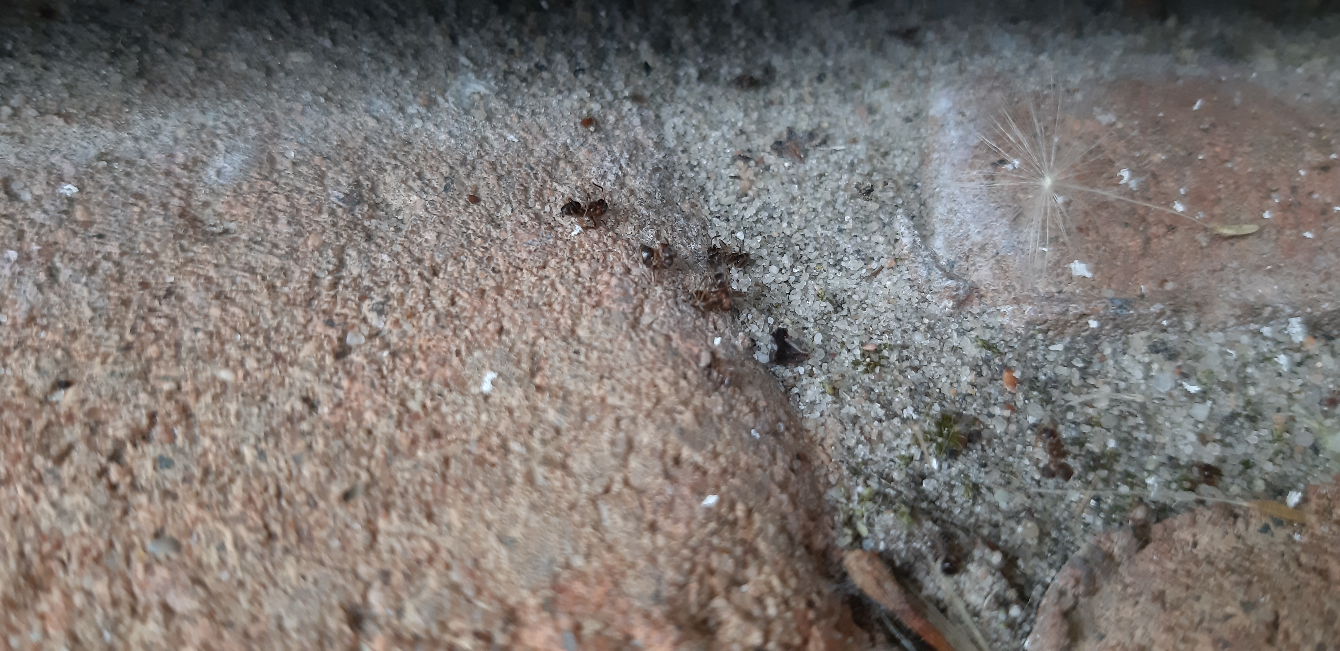 Eine Ameise hat wenn ich das richtig erkannt habe eine tote Ameise vom Nest wegtransportiert und auf den Steinen abgelegt (Bild anbei).