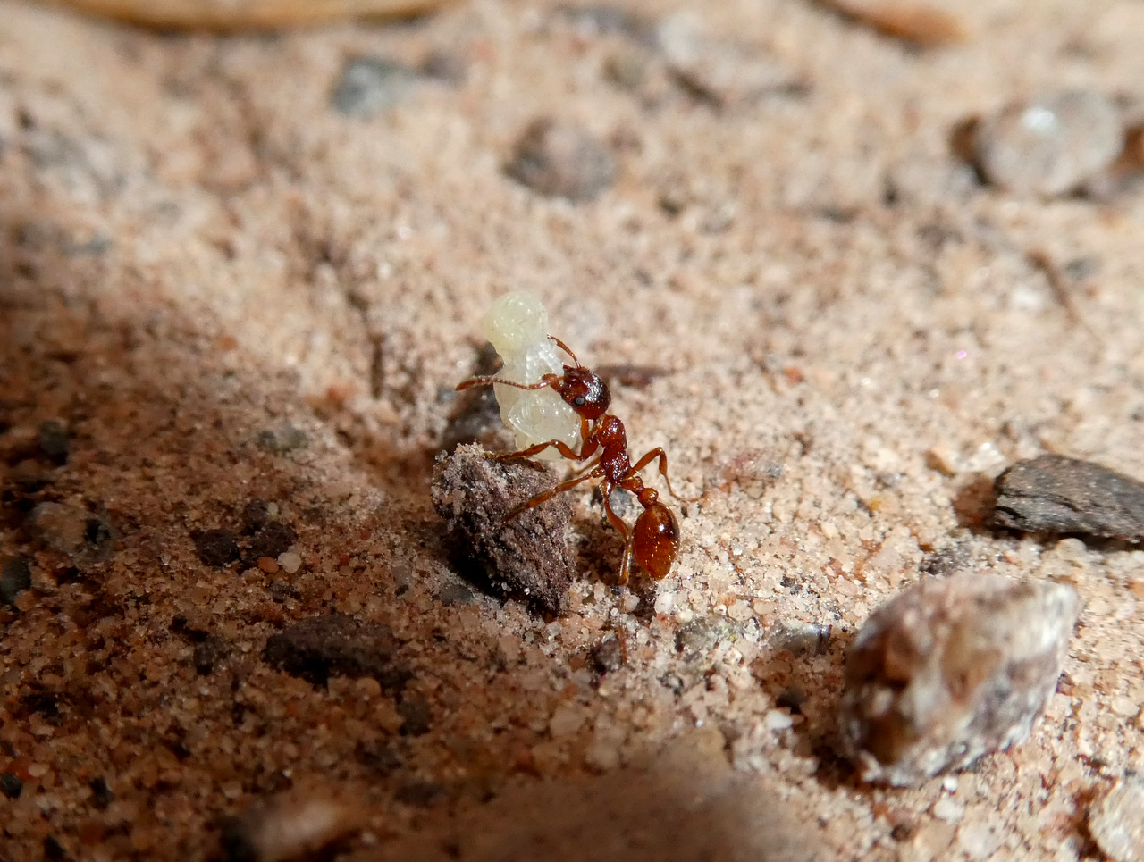 Gestern fiel mir eine groĂźe Menge Myrmica-Arbeiterinnen auf, welche den Weg ĂĽberquerten; einige davon mit Brut.