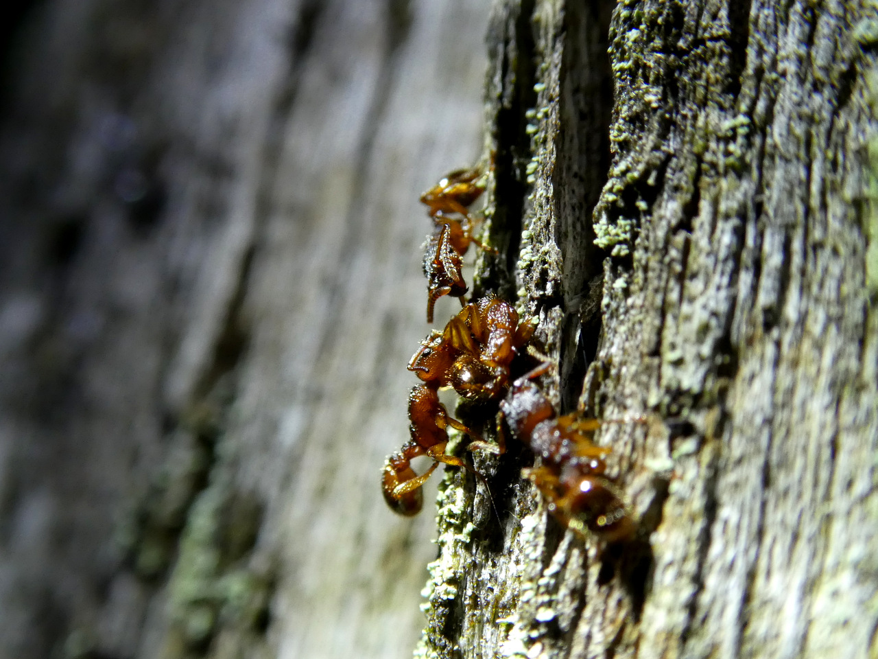 Myrmica-Arbeiterinnen strecken eine fremde (?) Arbeiterin; diese versucht sich mit ihrem Stachel zur Wehr zu setzen.