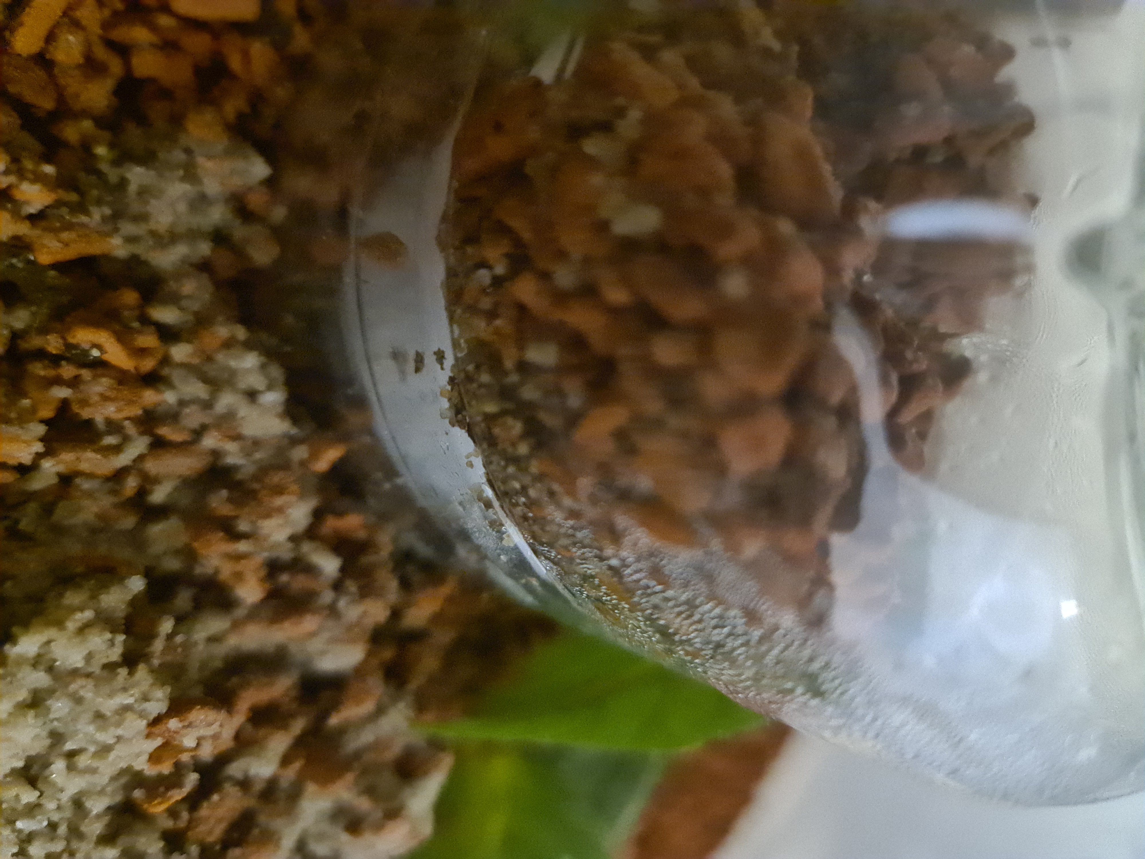 Ihnen scheint mein Setting zu bekommen und sind fleißig dabei zu Bauen. Ich verstehe nur nicht ganz was Sie bauen. Um ideale Feuchtigkeit zu gewährleisten habe ich den Pilz unter ein PET-Flaschenende gesetzt. Die Attas bauen jetzt auf dem Pilz. Haben Seramis und Sand aufgeschichtet. Pilz und VG