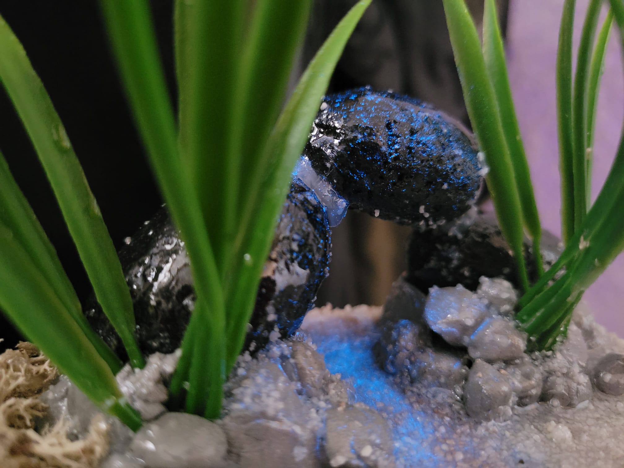 Für die Versiegelung habe ich mir den Honey Resin Epoxit geholt. Da er einerseits einiges Dickflüssiger ist als andere Harze und auch klar für Aqua- und Terrarienbau empfohlen wird (ausserdem Duftet er lecker nach Honig). Vor dem Einstreichen habe ich an gewissen stellen noch etwas vom «Glow in the Dark» Pigment Pulver verteilt, damit es am Abend noch etwas leuchtet nachdem die LED aus sind (ob man davon dann auch was sieht ist noch Fraglich)