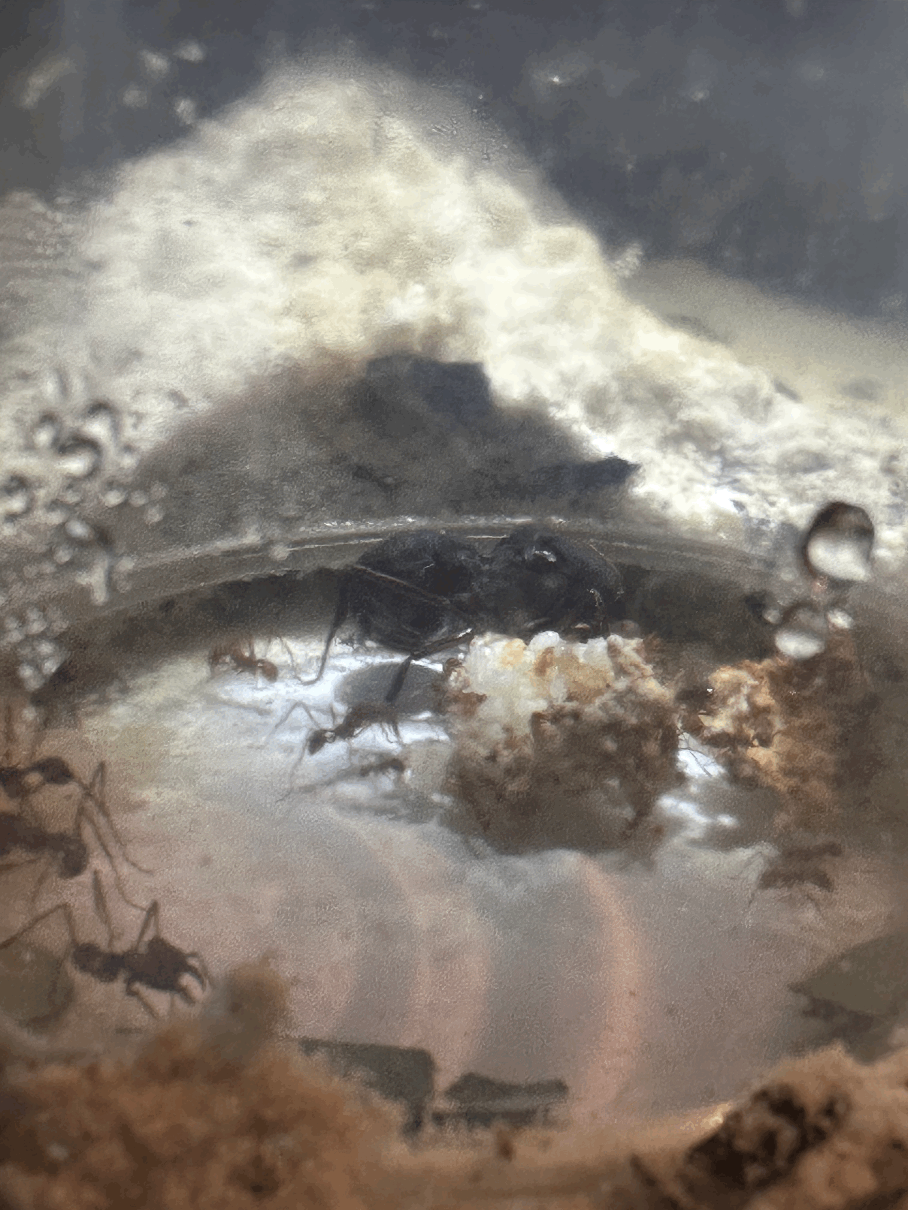 Ich habe dann nur ein Aquarium (von 3) genommen und mit etwas angefeuchtetem Sand gefüllt, weil ich dachte 3 Kammern wären für die paar Ameisen vielleicht zu groß. Dann habe ich den verkrümelten Pilz mit der Königin in die Mitte unter einen kleinen Plastikbecher gesetzt. In der Kammer hatte es 24 Grad und 85% Luftfeuchtigkeit. Sie hatten eine Wassertränke, einen Tropfen Honig, Apfel, Rosen- und Brombeerblätter. Haferflocken haben sie bisher nicht genommen.