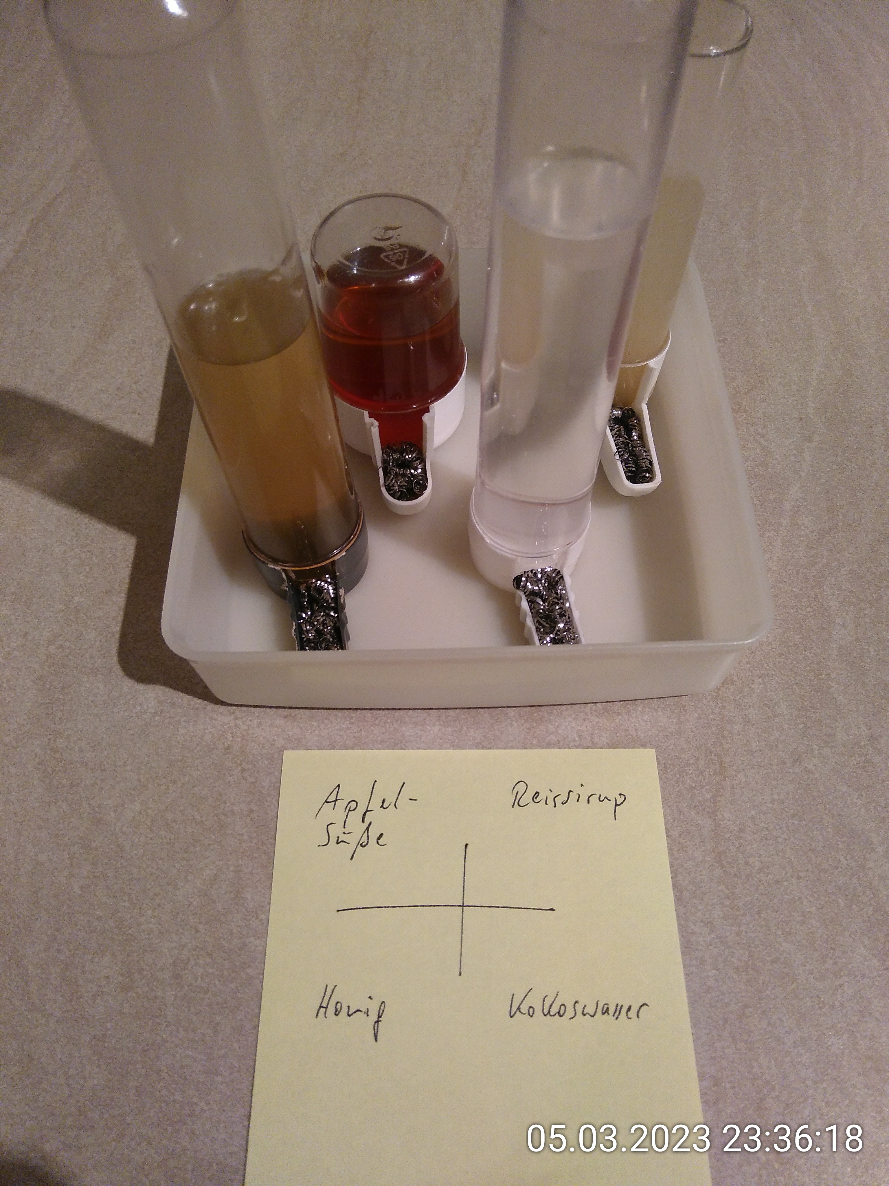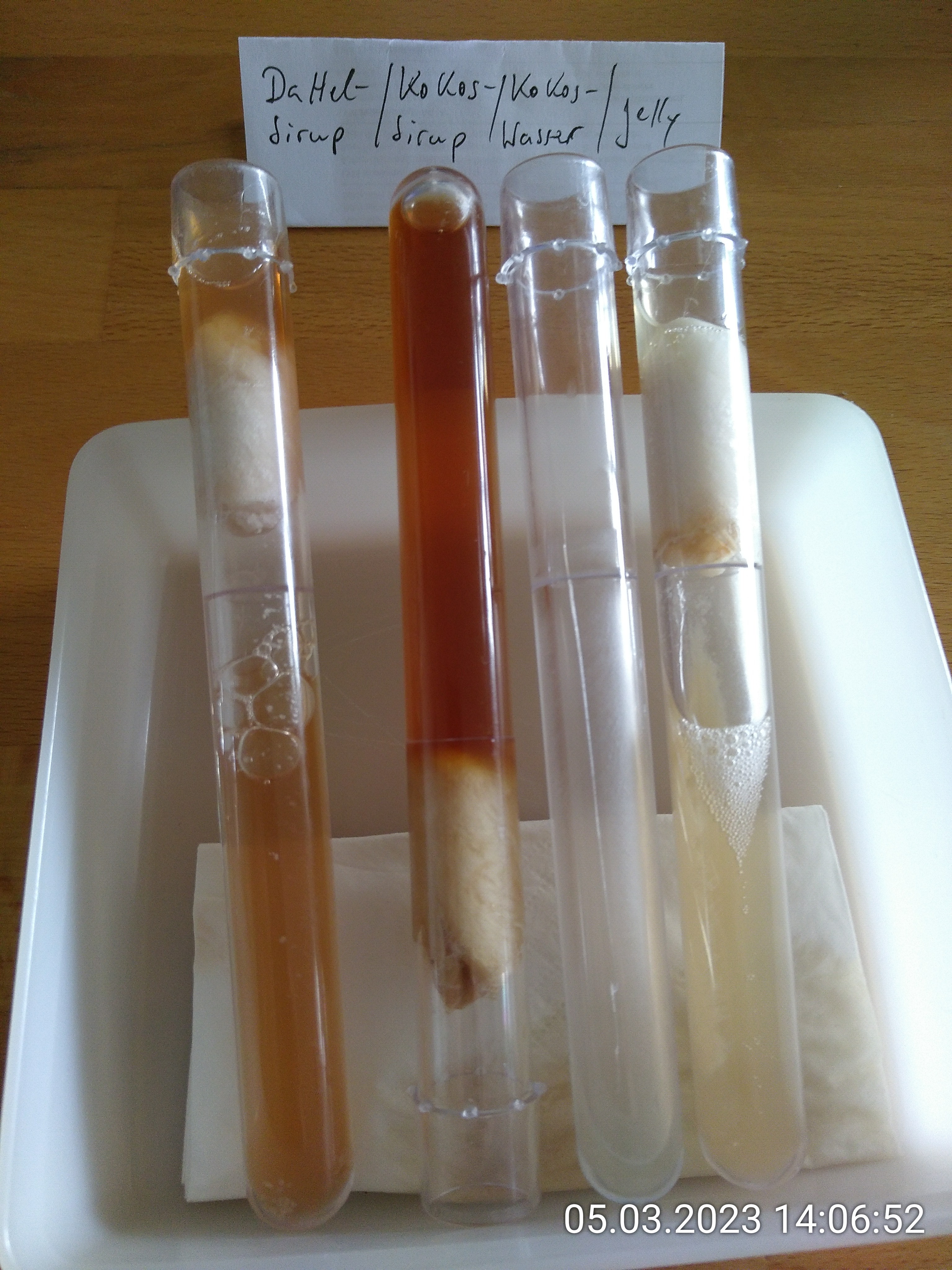Nachts war dann Kokoswasser aus dem Rennen. Es hatte sich schon angedeutet. Bei Dattelsirup ist auch eine Tendenz erkennbar. Das MyAnts-Jelly "flockt immer schnell aus" (als Schorle). Die festen Bestandteile sinken nach unten.