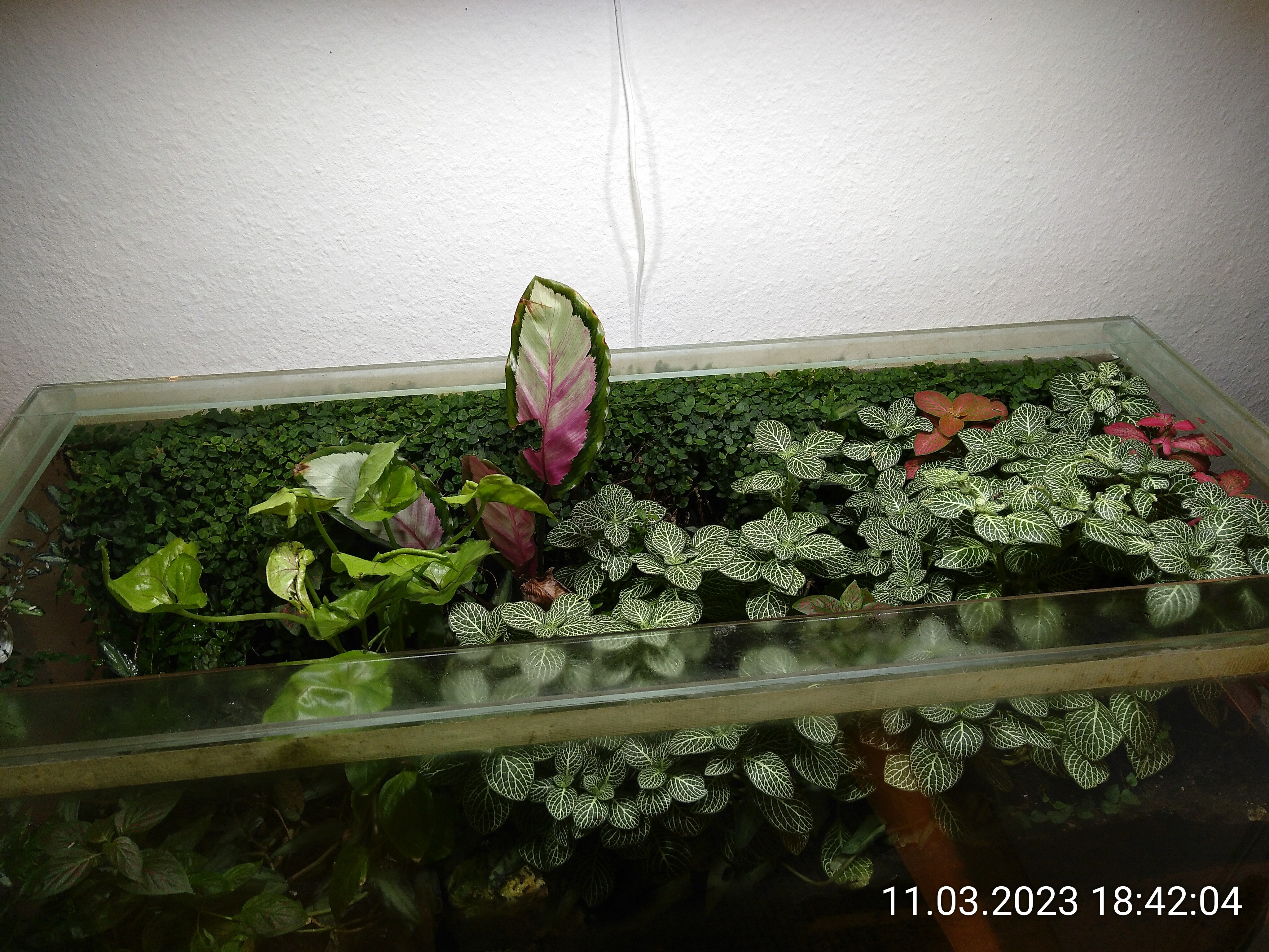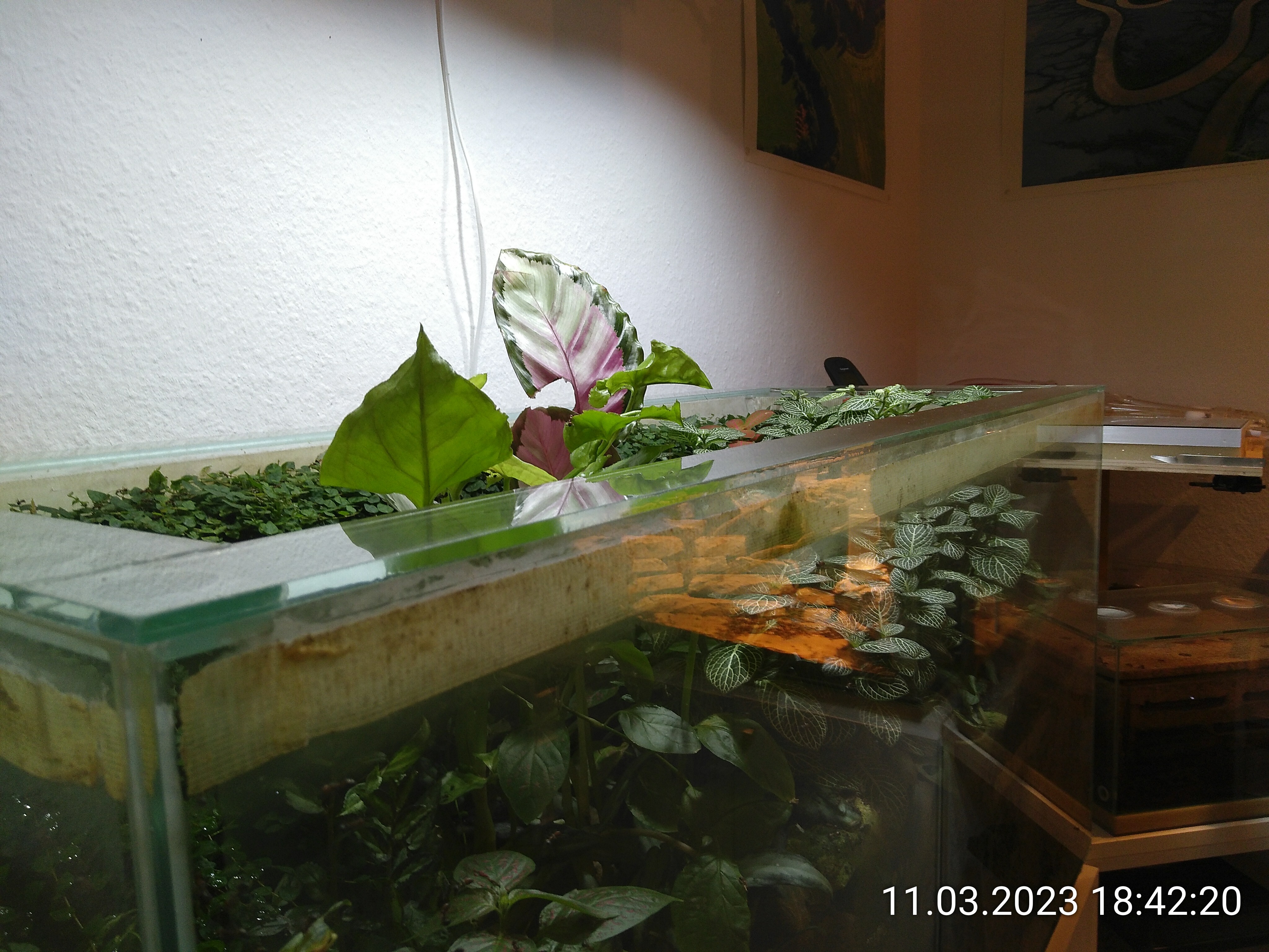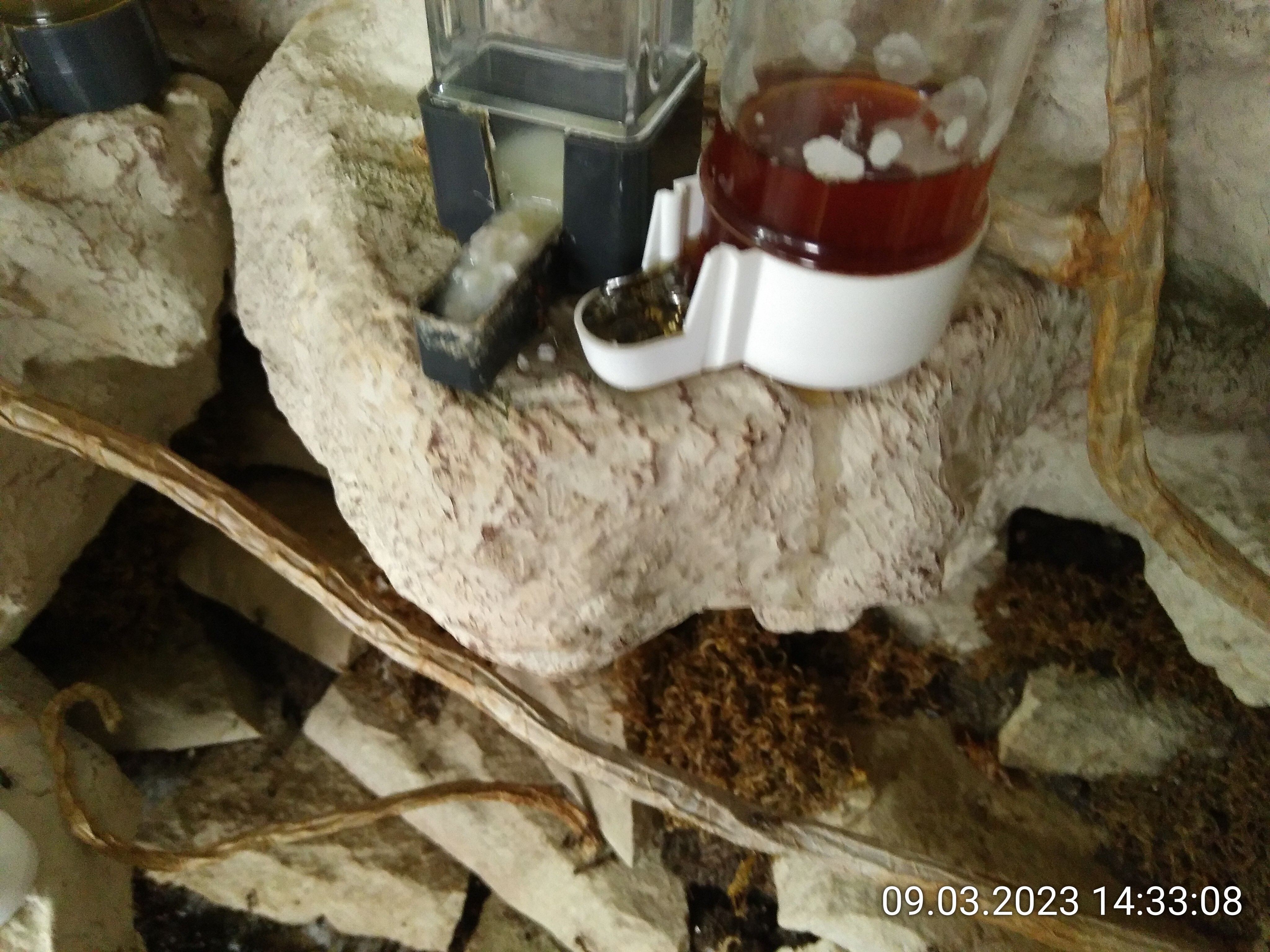 3 von 4 sind ausgelaufen. Kaum zu glauben. Auf allen 3 Bildern kann man sehen, wie die Schorlen ihre Spuren auf der Rückwand hinterlassen. Von den Pfützen haben die Nicos getrunken, obwohl sie die Tränken vorher ignoriert haben. Das Kokoswasser hält noch, wird aber auch nicht konsumiert.