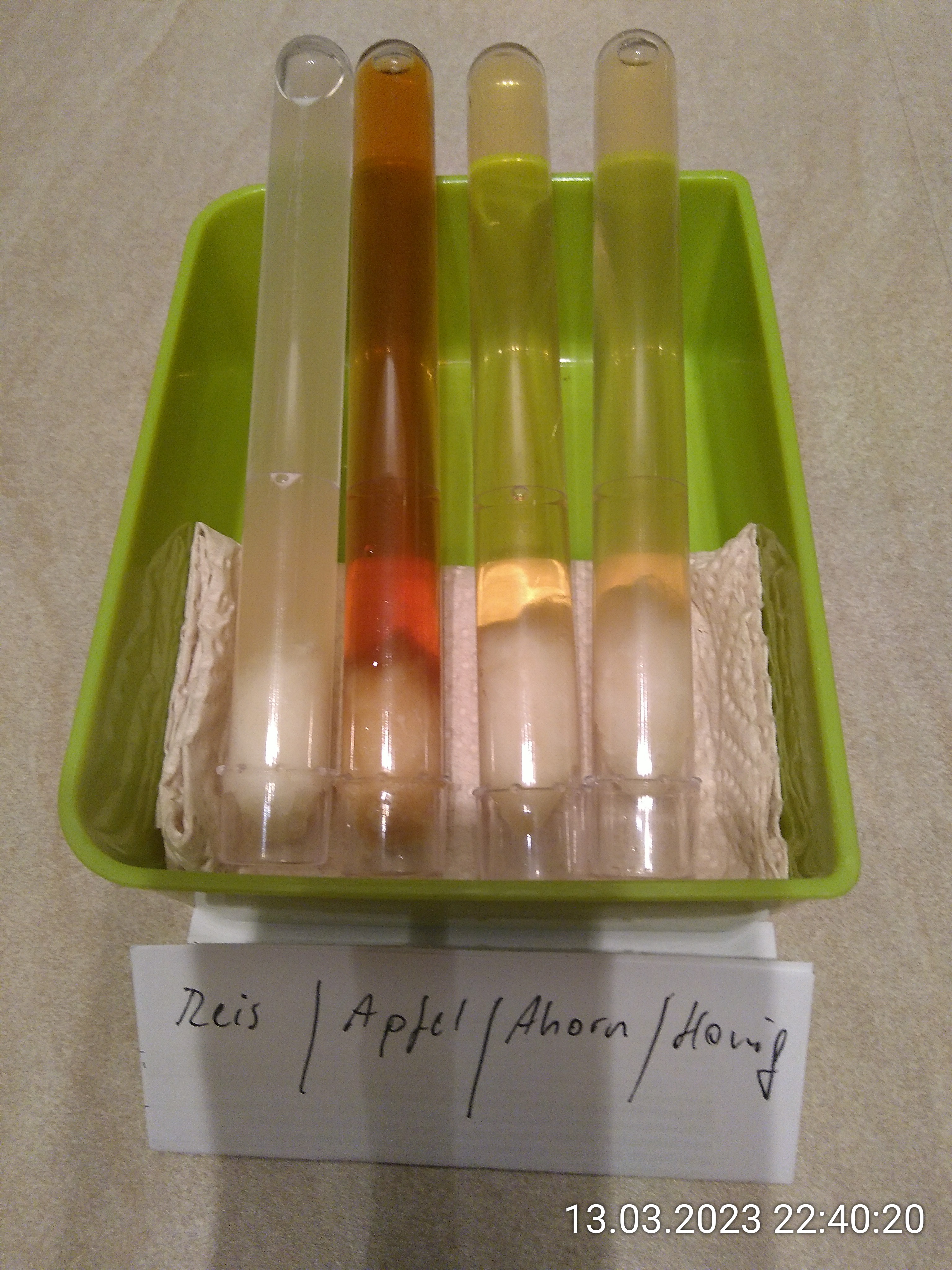 Nur Kokossirup hält noch dicht. Der Dattelsirup hat sich merkwürdig verhalten. Nach dem Umdrehen des RGs hat sich Flüssigkeit über dem Wattestopfen gesammelt. Es lief fast über.