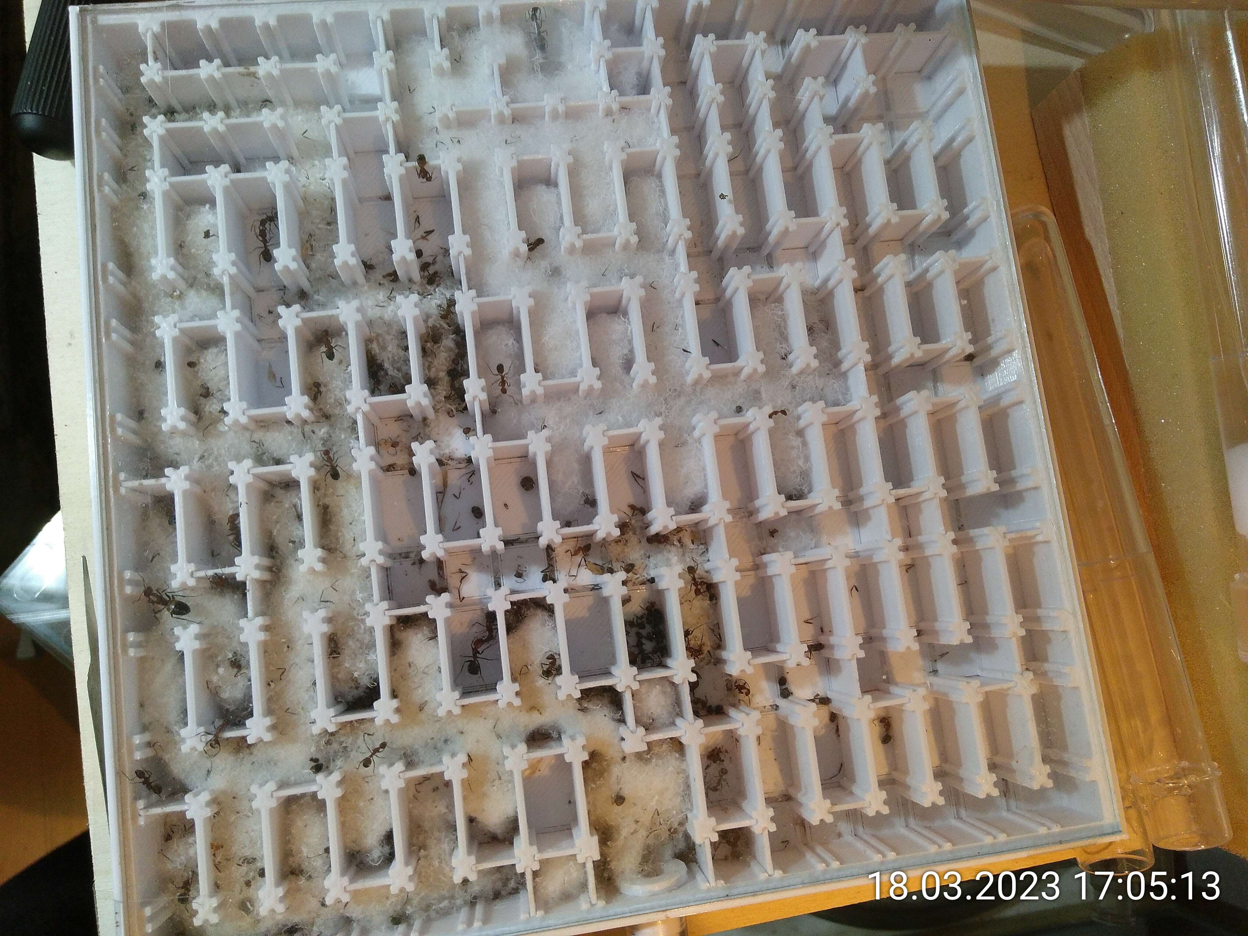 Auf dem Foto kaum zu sehen, aber mittlerweile sind mehrere Kammern mehr oder weniger voll mit einer Mischung aus Watte und Müll. Ich habe dann mal wieder nachgewässert.