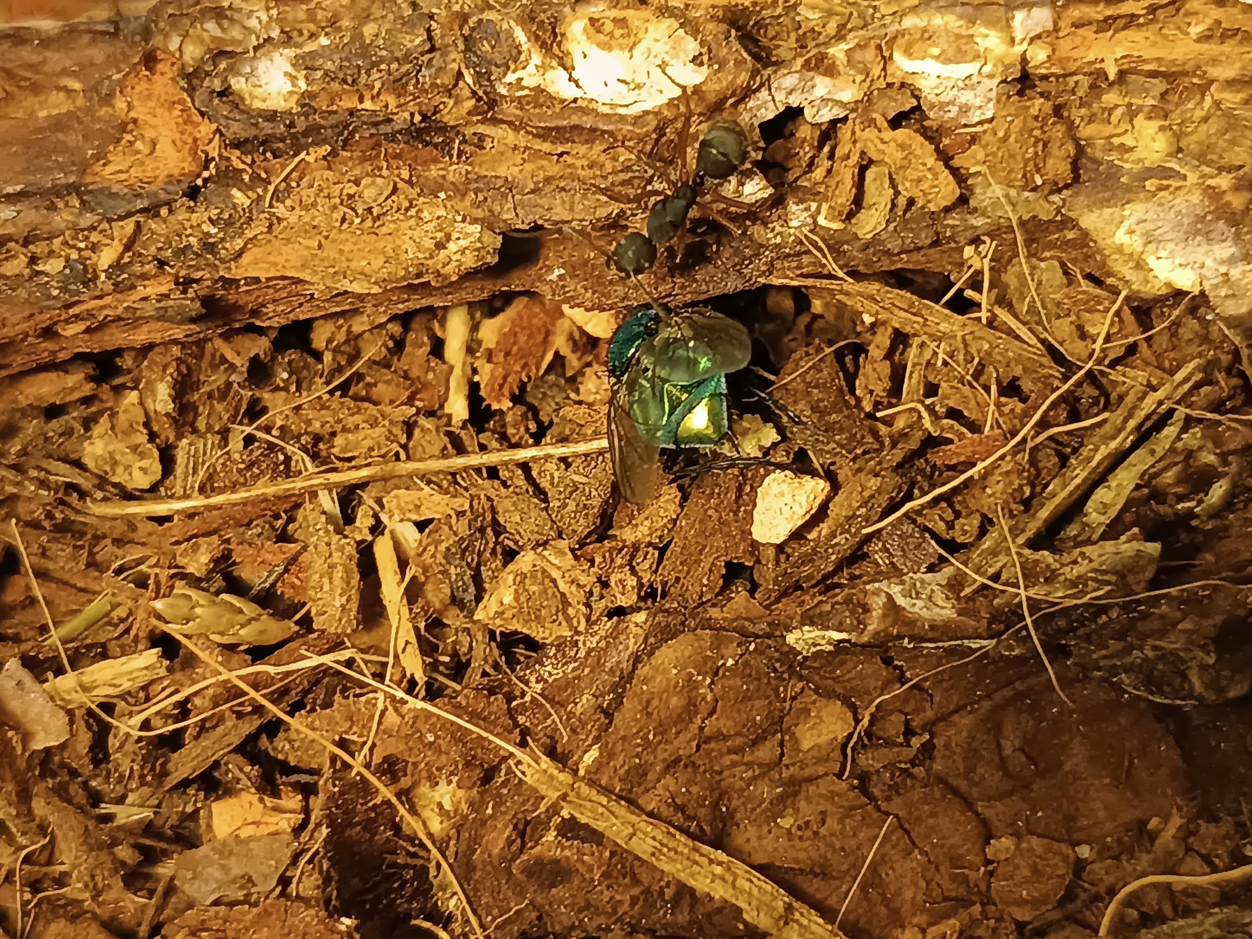 Vorgestern habe ich die Rinde hoch abgenommen, darunter war ein gewusel von Ameisen und ein Berg Brut in allen Stadien. Der Königin ging es gut. Ich schätze die Kolonie auf 22-25 Arbeiterinnen.