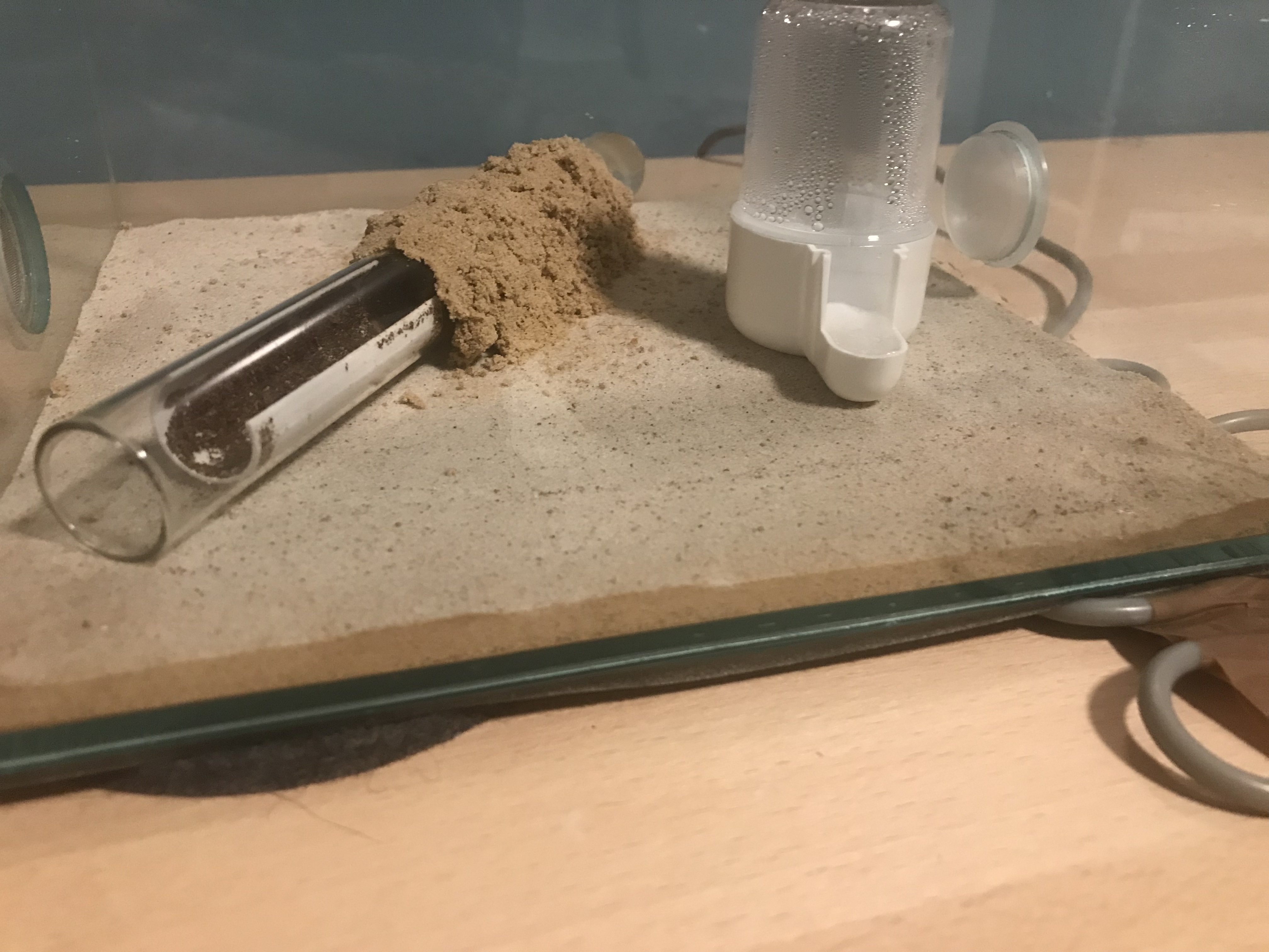 ich habe mir vor einer Woche eine kleine Camponotus rufipes Kolonie zugelegt. Zwei dieser Arbeiterinnen sind bereits verstorben angekommen und eine weitere ist vor ein paar Tagen gestorben. Die Königin mit ihren vier Arbeiterinnen werden unter Optimalen Klimabedingungen gehalten. Honiglösung wird akzeptiert aber Proteine nur in das Röhrchen gebracht und dann komplett ignoriert. Außerdem gibt es keine Brut, und nahezu keine AktivitĂ€t. Habe auch schon ein bisschen Erfahrung aber hierbei bin ich leider Ratlos.