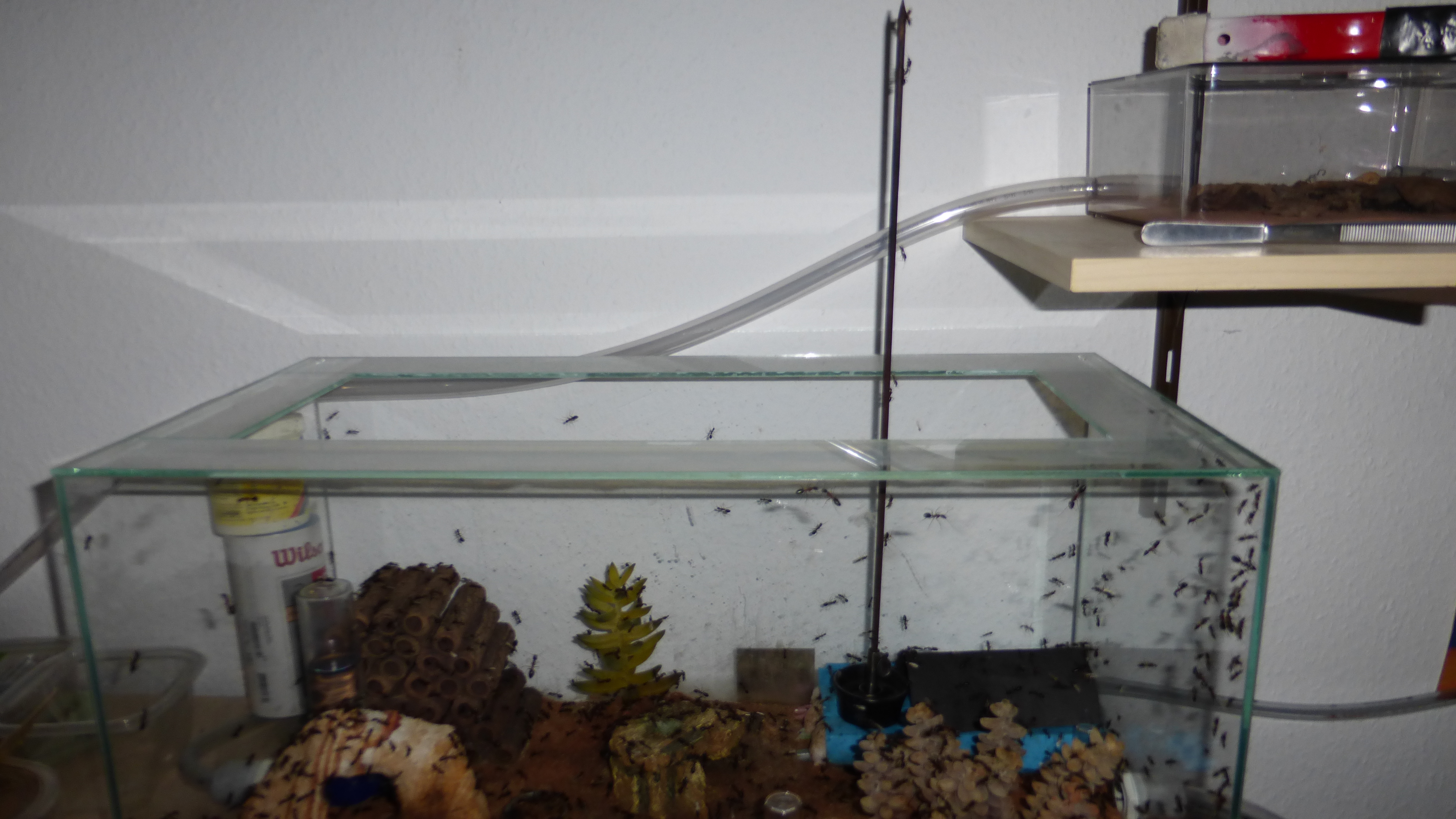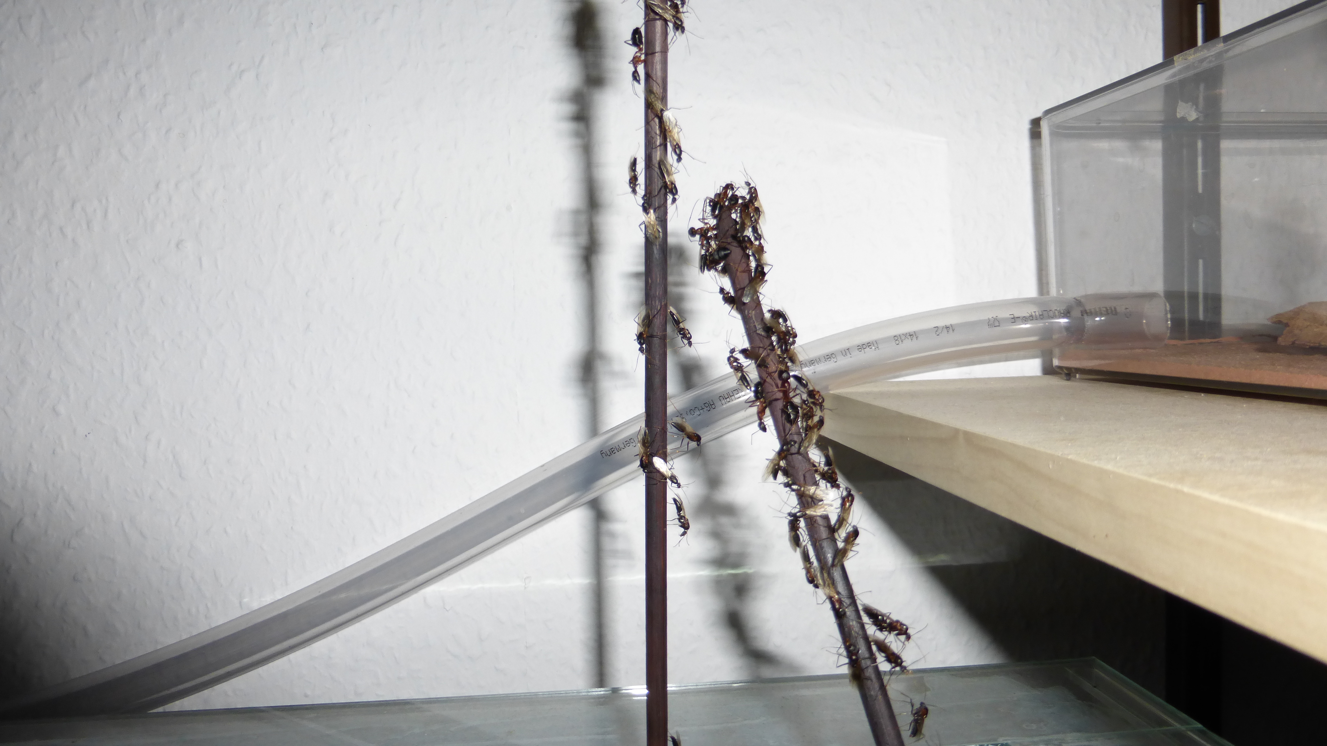 Und ja, ich hab ihnen eine Startstange zur Verfügung gestellt, denn ich hab keine Lust in das Becken zu langen und die Männchen aus einer Horde extrem aufgeregter Ameisen rauszusammeln - anderseits möchte ich aber auch nicht, dass sie mir bei jedem Flugversuch die massenhaft die Scheiben hochklettern und eventuell die Barriere durchbrechen. Es ist deutlich einfach sie von der Wand und der Fensterscheibe zu sammeln - die gehen eh zum Licht, ist recht einfach alle zu erwischen. Das einzig doofe ist, dass es bedeutet, dass das Fenster zubleiben muss und das im Hochsommer. Aber irgendwas ist ja immer, zum Glück mag ich's warm. :D