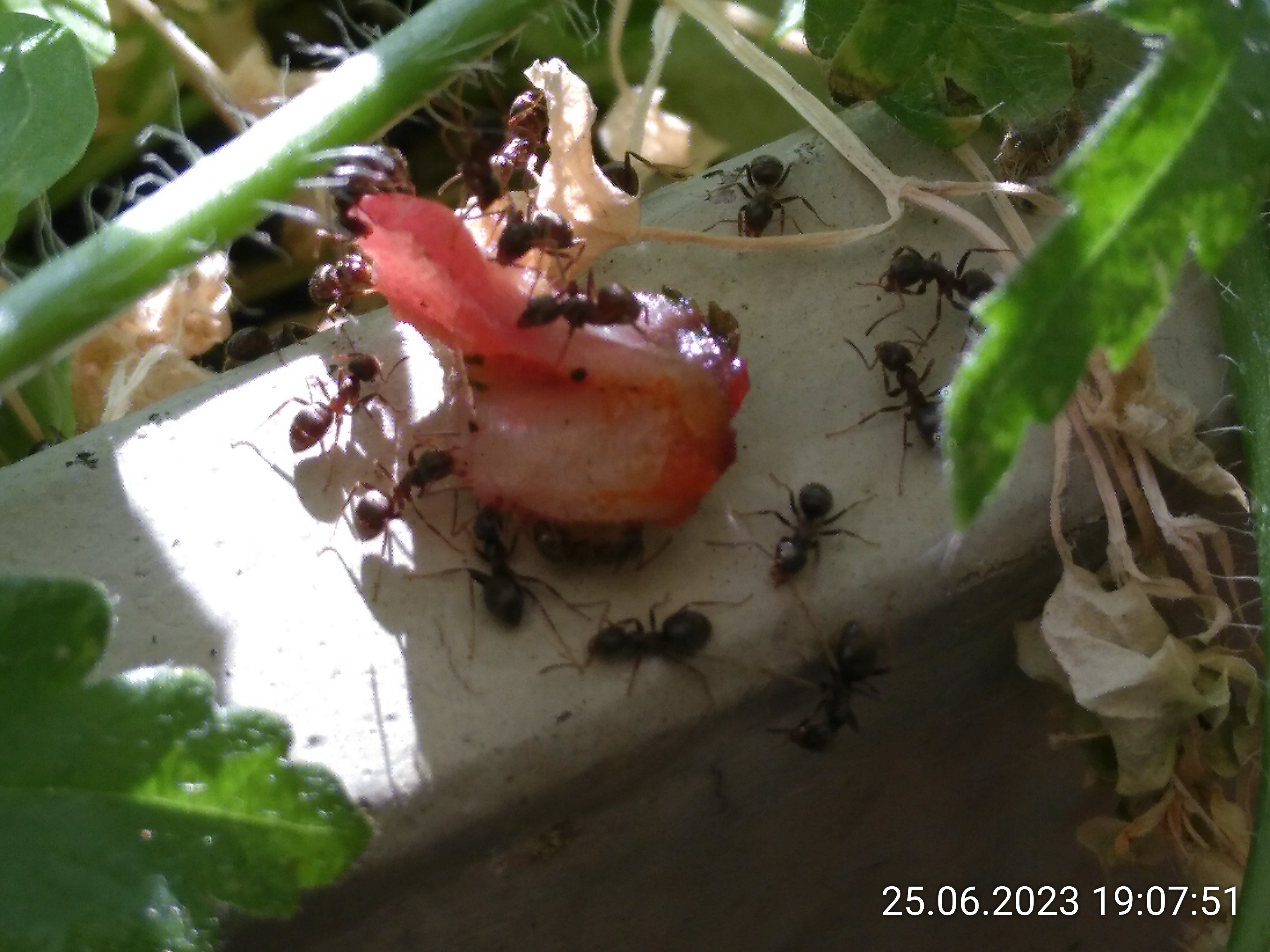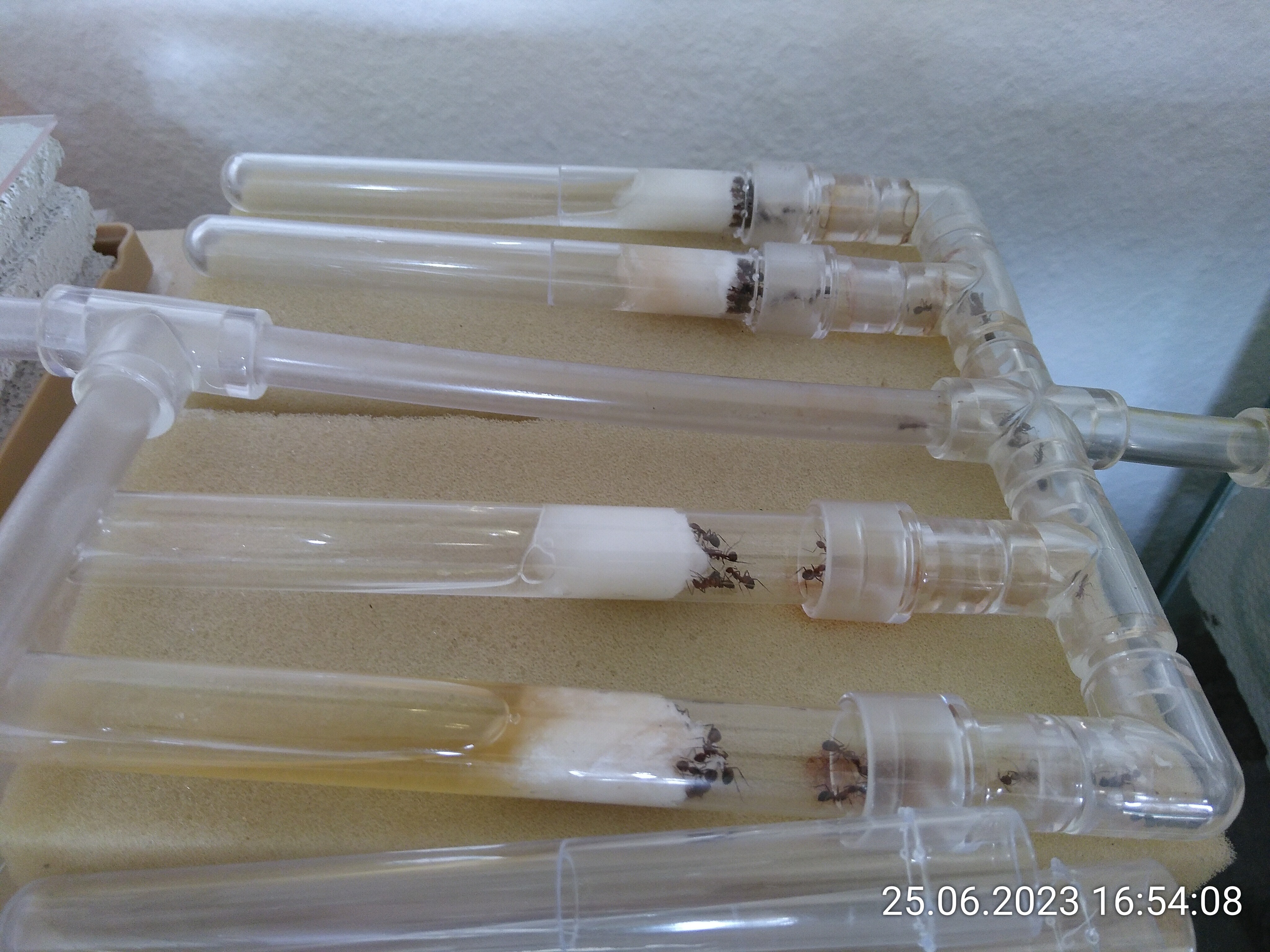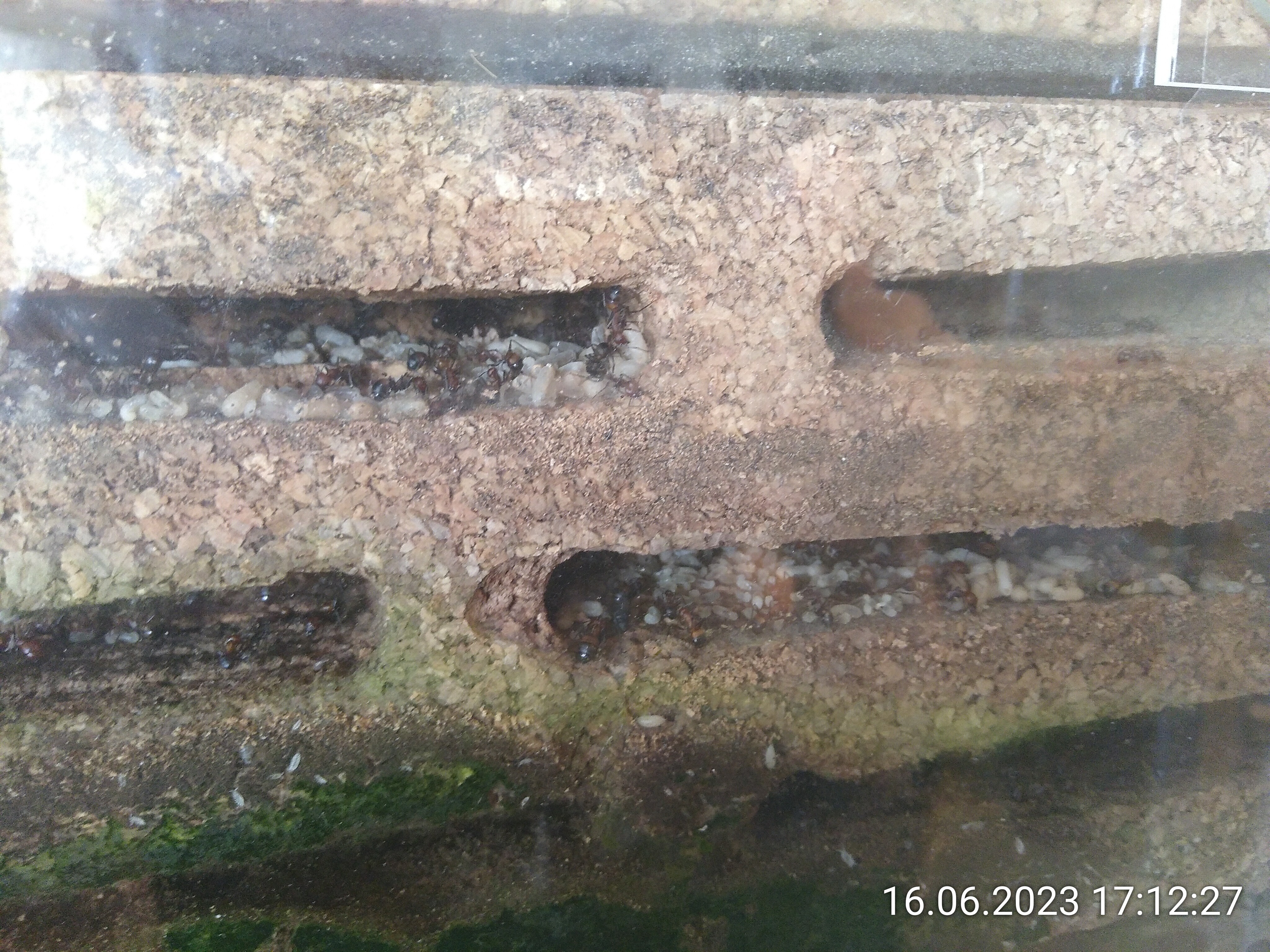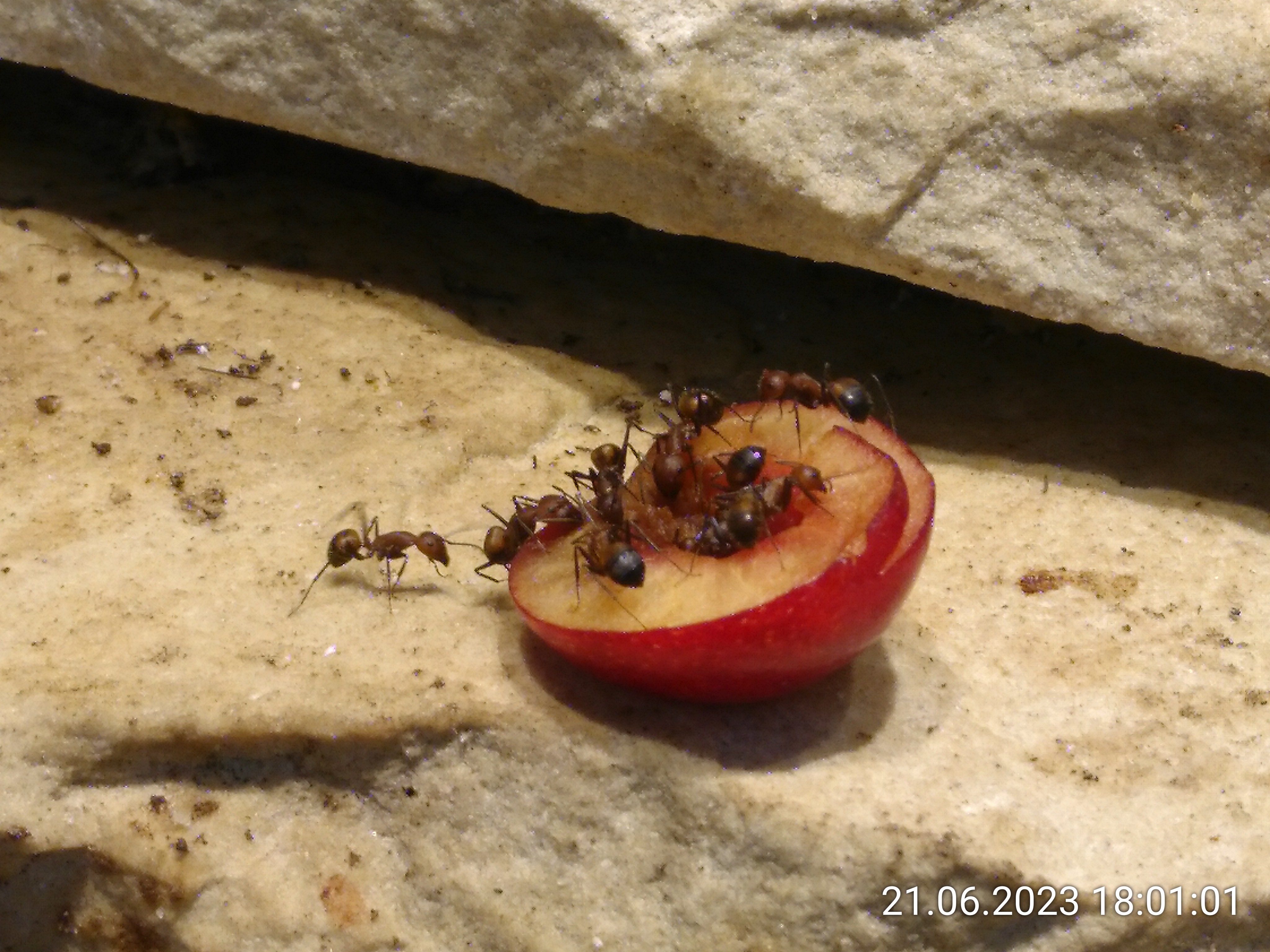 Das letzte Test-RG mit Apfel habe ich den Lasius balconicus angeboten. Sie haben reichlich davon getrunken, aber nach ein paar Tagen in der Sonne haben sie es dann ignoriert. So sah es ca. eine Woche nach ihrer Inbesitznahme aus.