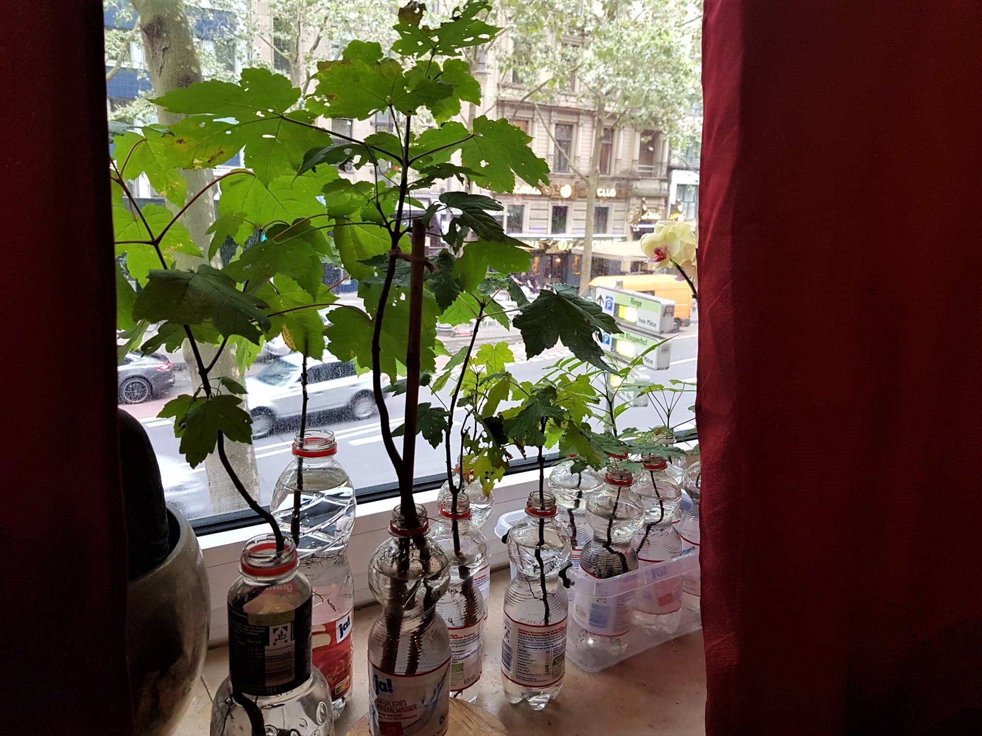 Von rechts nach links grĂ¶ĂŸer werdende Ahorn-Aufzuchts-Station auf der Fensterbank. Die Pflanzen können anfĂ€nglich in Wasser gehalten werden. Auf keinen Fall aber mehr als ein paar Wochen, dann setzt WurzelfĂ€ule ein und die Pflanze geht ein. Sie muss in Erde getopft werden, wenn die Wurzeln sich im Wasser ordentlich ausgebildet und eventuelle BeschĂ€digungen geheilt sind.