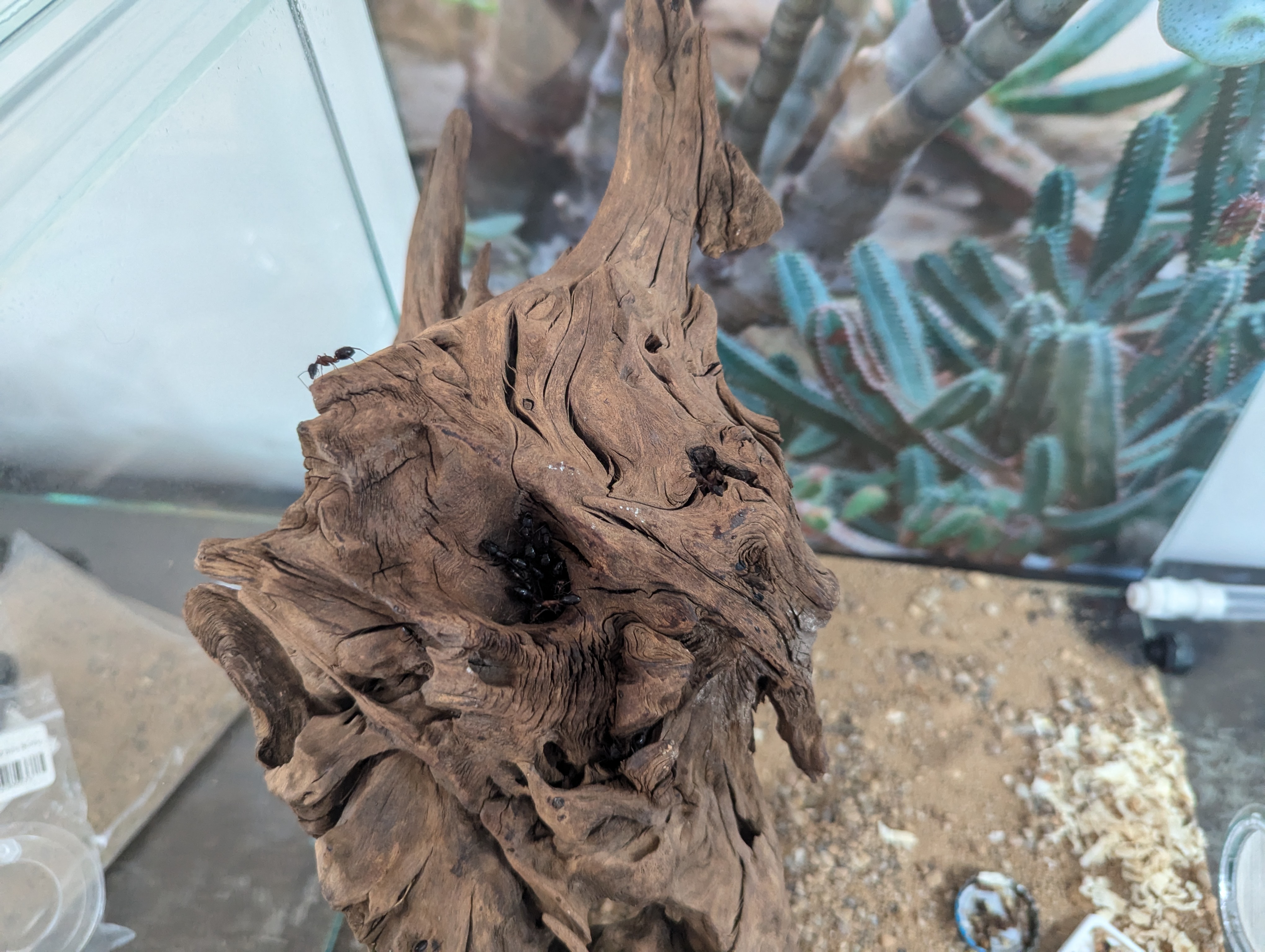 Nun ist es allerdings Zeit die Kolonie in die Winterruhe in den Keller zu schicken. Ich bin noch am überlegen, ob ich nur das Nest in den Keller mache, oder samt der kleinen Aussenwelt. Leider sind dort ein paar Arbeiterinnen in das Treibholz "eingezogen" und es ist bei der Grösse von Kolonie unmöglich einen Zeitpunkt zu erwischen, bei dem alle Arbeiterinnen im Nest sind.