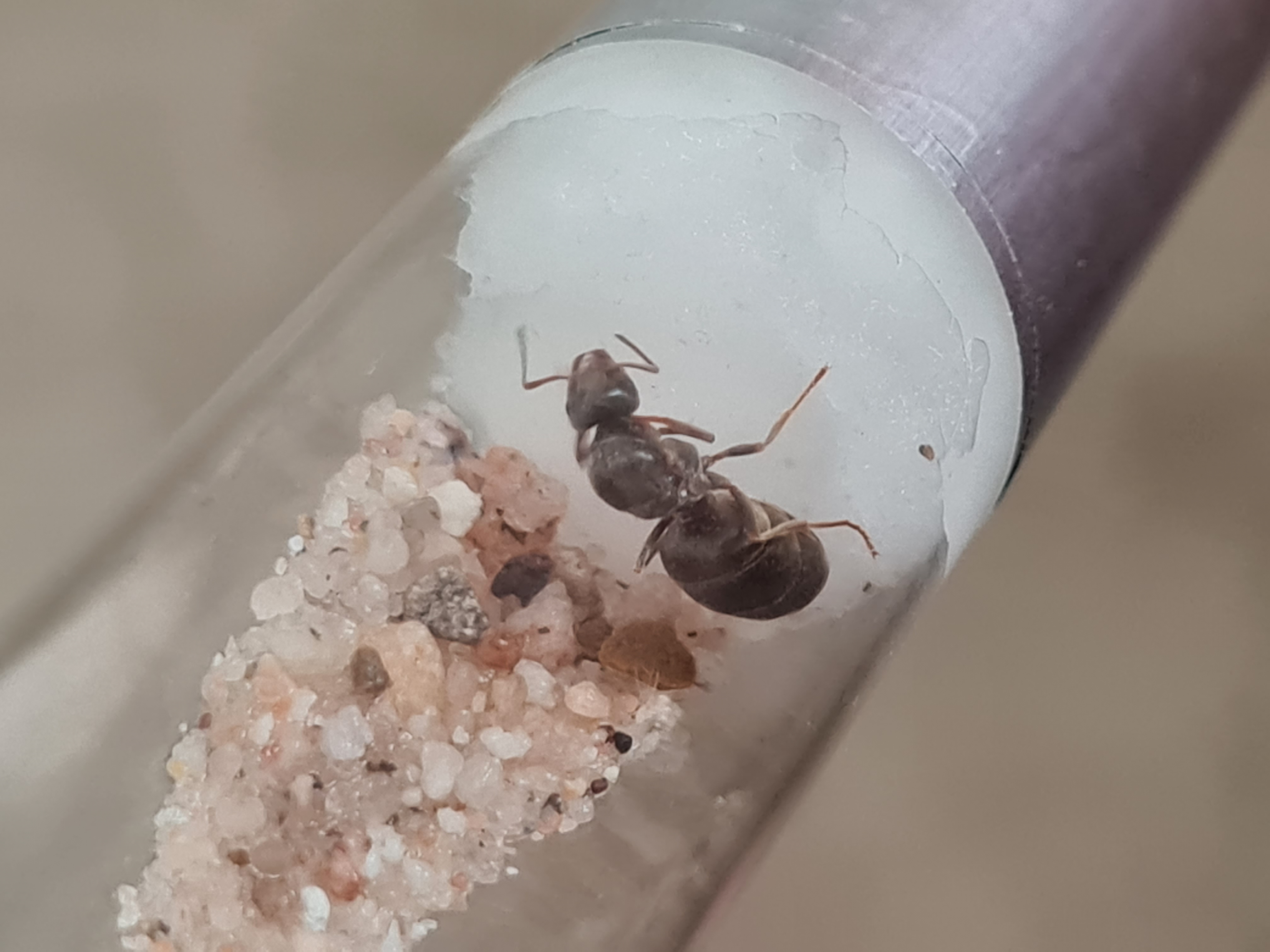 Es handelt sich hierbei um meine Formica cunicularia, die ich am 05.07.23 gefunden habe. Zusammen mit ihren Kokonpuppen und der allerersten Arbeiterin, die überhaupt bei mir geschlüpft ist