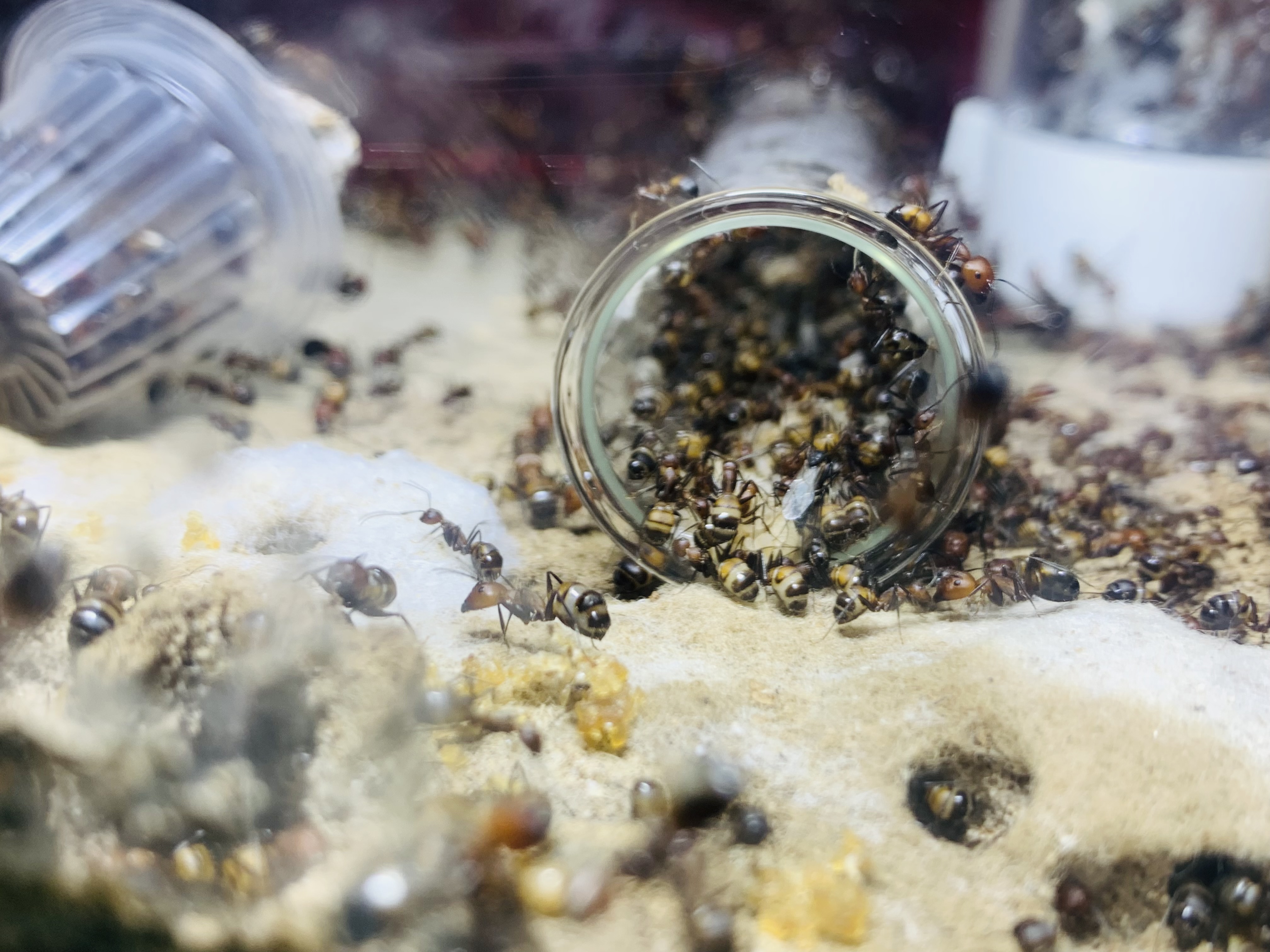 Im Sommer 2021 kam der erste Schwung an Geschlechtstieren sehr viele Jungköniginnen und Männchen wurden aufgezogen. Zuerst ist man richtig stolz, dass sie das machten, jedoch wurden diese irgendwann fast zur Plage. Trotz dem riesigen Potenzial der Jungköniginnen sind sie in der Heim-Ameisenhaltung nur Ballast. Ich habe fleißig Jungköniginnen und später auch Männchen aussortiert.