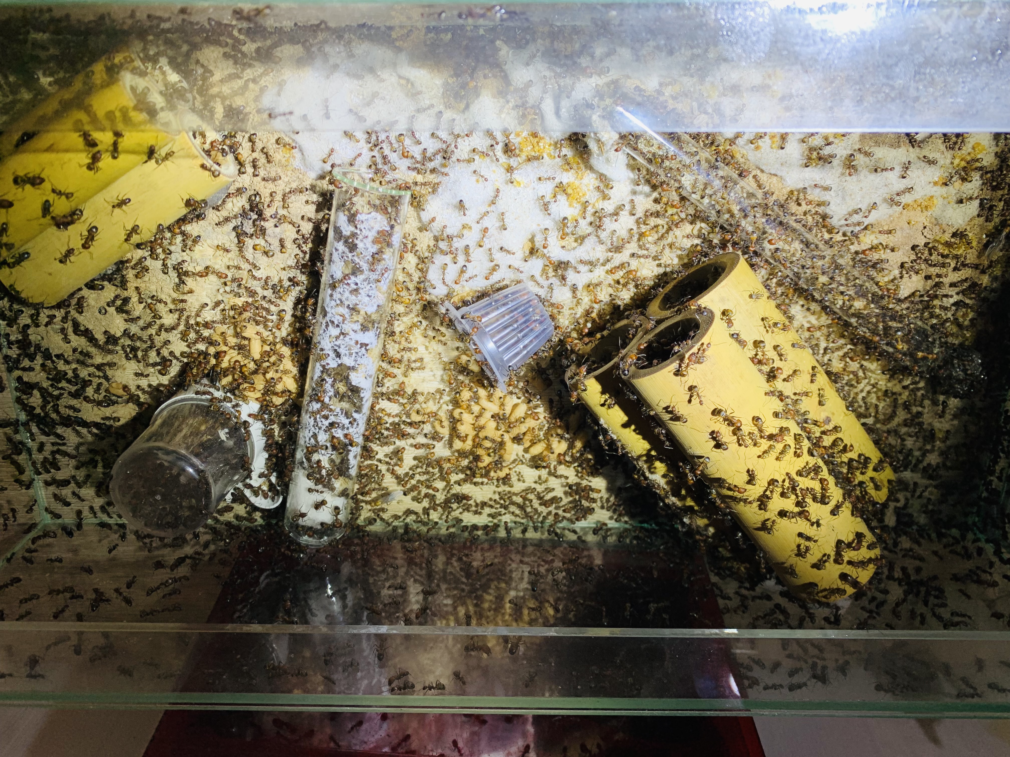 Kolonie 3: ca. 50 Arbeiterinnen, das Reagenzglas war irgendwann trocken, habe ihnen dann daneben ein neues Reagenzglas hingelegt. Sie gingen nie ins neue Reagenzglas und sind in ihrem Glas wohl verdurstet.