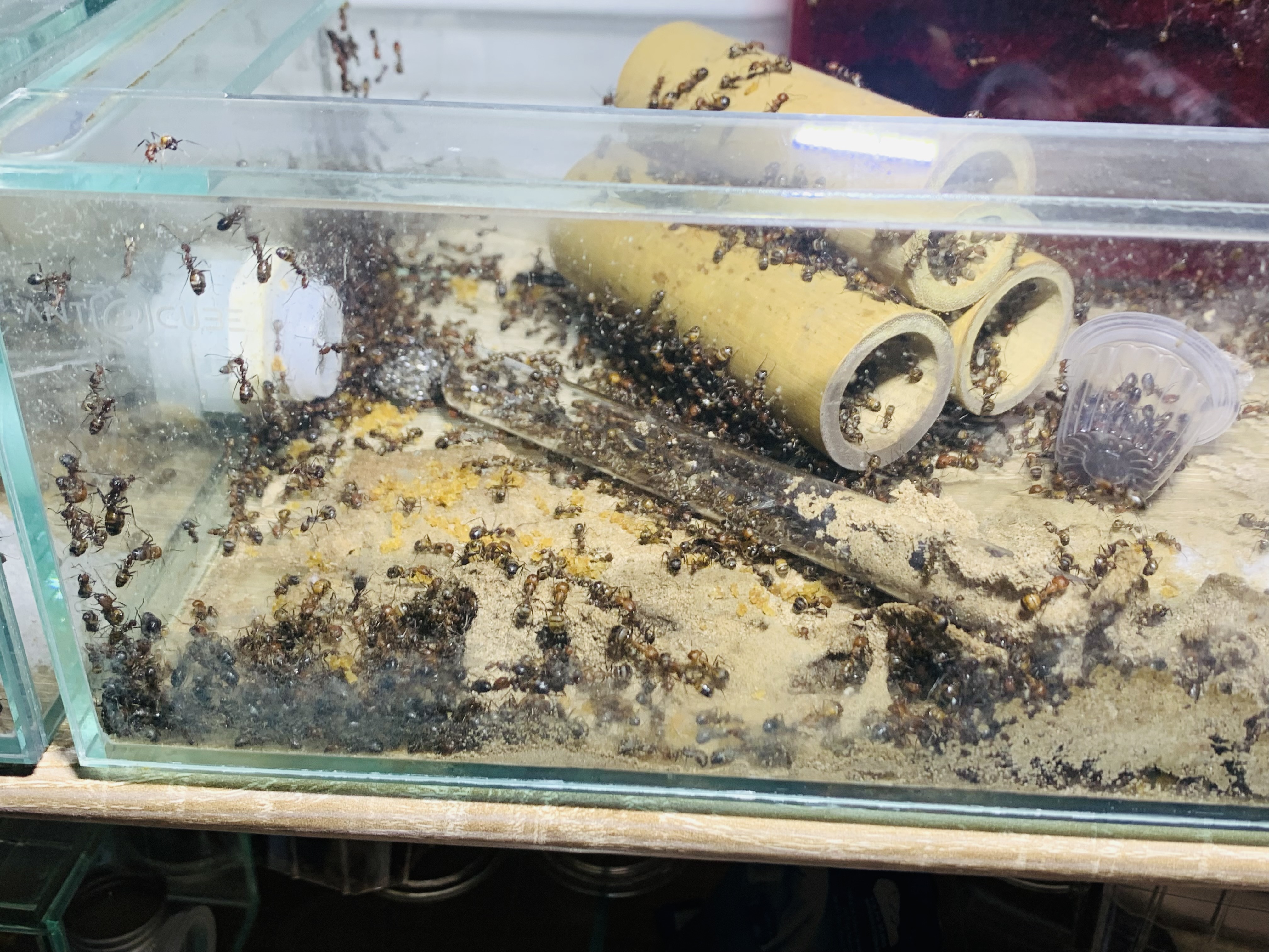 In der Arena 200x200x100 wo es eigentlich immer die Heimchen zum fressen gibt (Lebendfütterung) türmen sich tote Ameisen!
