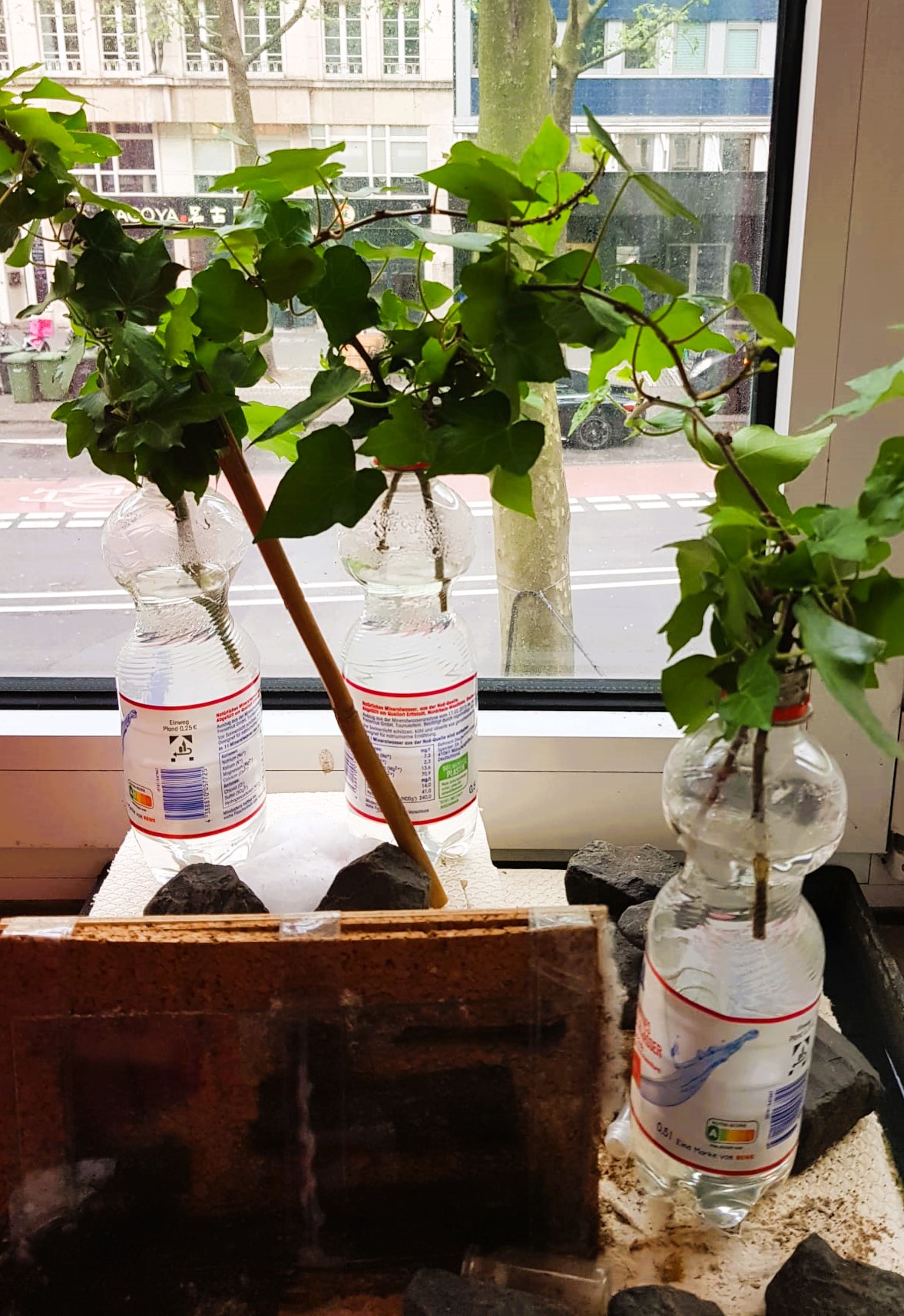 In den letzten Tagen versuchten meine Formica cunicularia ungewohnt hartnäckig, den Wassergraben zu überwinden. Heute entdeckte ich eine kleine Straße Richtung Fensterbank und musste feststellen, dass ein Teil meiner Blattlaus-Planung für dieses Frühjahr sich von selbst erledigt hatte. Die im Winter gesammelten Efeu Ableger, die auf der Fensterbank im Wasser stehen, tragen bereits von selbst eine Menge kleine Blattlaus-Kolonien. Da diese Fenster immer geschlossen sind, wird es sich um den Schlupf von Wintereiern gehandelt haben, die beim Sammeln auf der Pflanze waren.