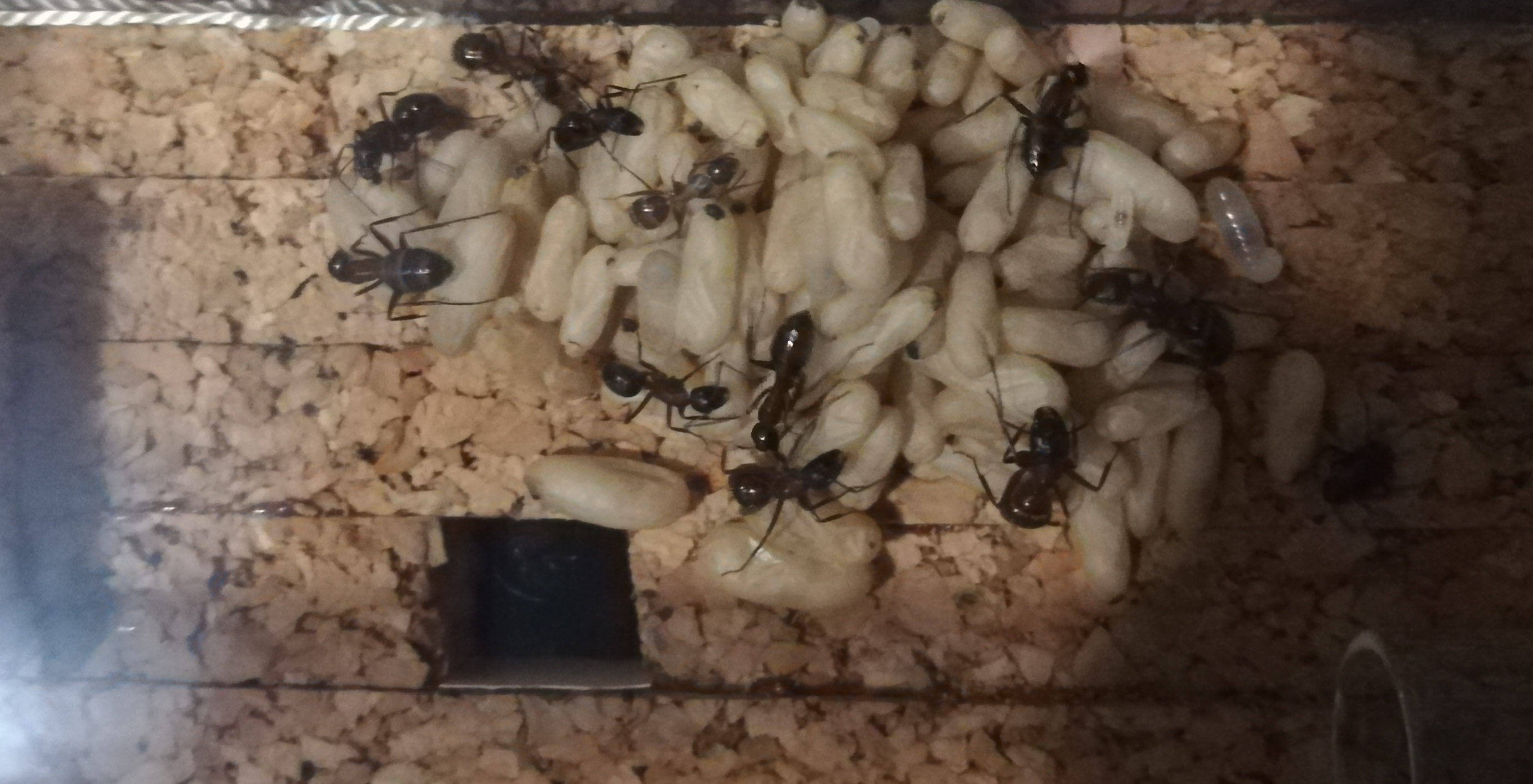 13 Oktober 2019. Sämtliche Puppen sind geschlüpft, die restlichen Larven wurden zurück ins Nest geschleppt, und die gesamte Kolonie hockt nun im Nest. Arbeiter konnte ich auf dem Bild nicht