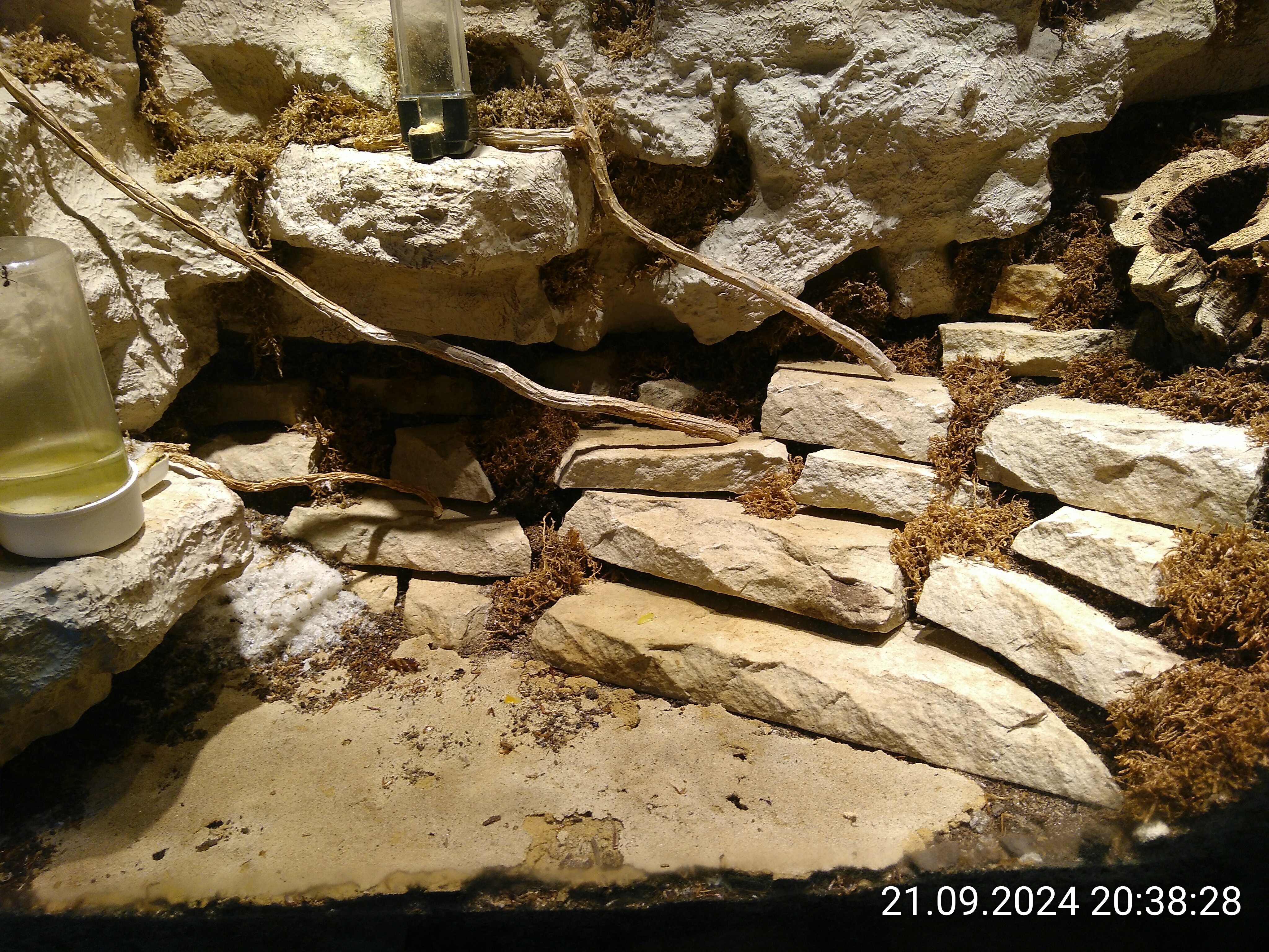 Ich kenne meine Wohnung und weiß, dass sie kein Reinraum ist. Wo ich nicht regelmäßig Staub wische, bildet sich eine immer dickere Schicht. Im Steinbruch müsste mittlerweile eine mehrere cm dicke Schicht liegen. Mir ist klar, dass die Laufwege der Ameisen den Staub verteilen und sie dafür sorgen, dass sich keine dicke Schicht bildet, aber egal, wo ich schaue, im Moos, in Ritzen, Vertiefungen etc., nirgends ist Staub zu sehen. Aber er kann ja auch nicht weg sein. Die Nicos "bringen ihn ja nicht raus". Habe ich ihn mit dem Müllhaufen entsorgt? Wurde er von den Springschwänzen gefressen? Können meine Nicos zaubern?