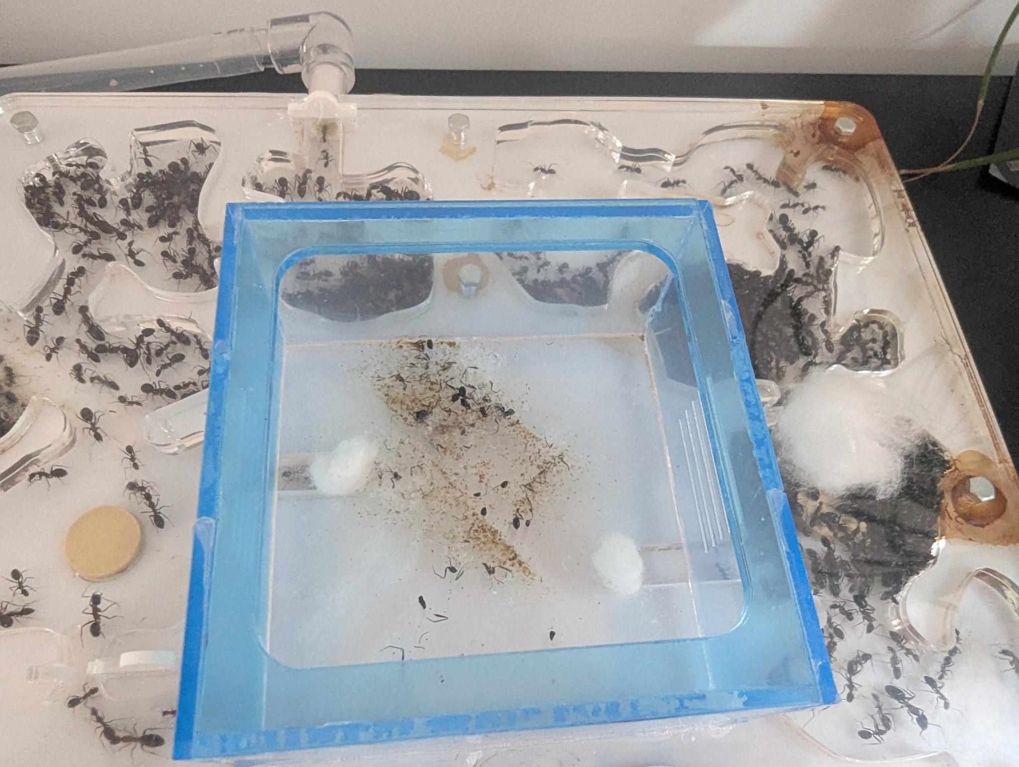 Danke für deinen Kommentar. Ich hab daraufhin mal nach Schläuchen geschaut und dabei mein altes Antcanada-Zeug gefunden. Da ist ein kleines Mini-Nest und ich könnte es als Nest im Nest platzieren! Das Gute ist, dass das Nest vollständig abgeschottet ist und die Stopfen Löcher haben. Somit kann der Geruch sich verbreiten, aber die Königin sollte vollständig geschützt sein. Leider ist im Aussenbereich dann nicht mehr viel Platz. Wenn ich dann die Watte entferne, mache ich mir etwas Sorgen, dass dann der Bereich überschwärmt wird. Vielleicht stelle ich erst mal das Nest rein und klebe die Zugänge mit einem Gitter ab, sodass der Geruch schon mal so zieht. Ich glaube nicht, dass die rechte Seite sehr leider würde, wenn ich sie ca. 1 Woche nicht füttere. Wasser haben sie ja. Vielleicht mache ich auch die Löcher kleiner, sodass nur kleine Arbeiterinnen in den Bereich kommen können.