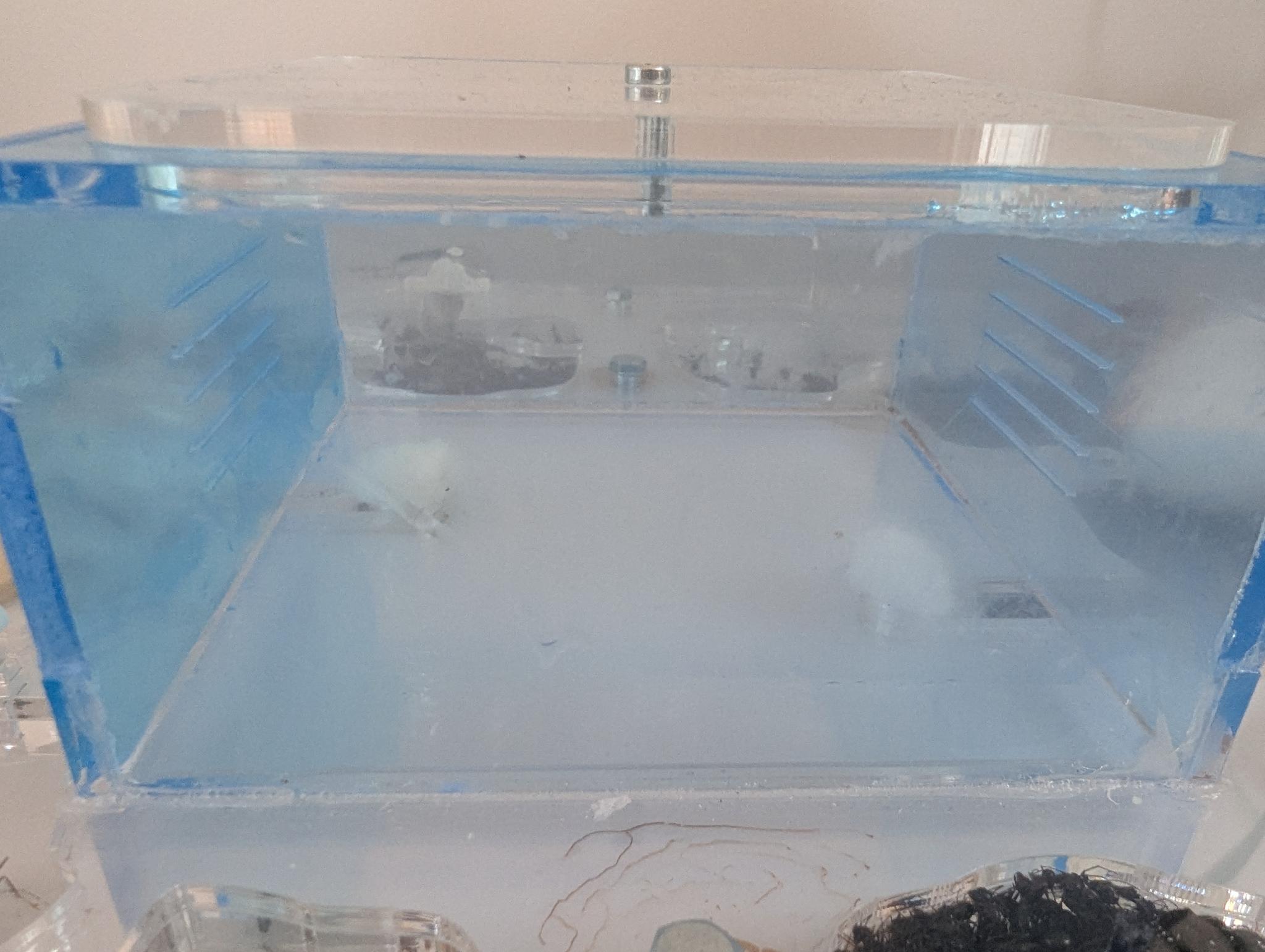 Ich habe nun die tote Königin entfernt und beide Ausgänge verstopft. Zusätzlich habe ich die Arbeiterinnen nun auch aus dem Aussenteil entfernt. Mit Watte ging das erstaunlich gut, da sich die Arbeiterinnen entweder verfangen haben oder sich daran festgekrallt hatten. Somit konnte man sie leicht antupfen und immer einen Teil rausholen.