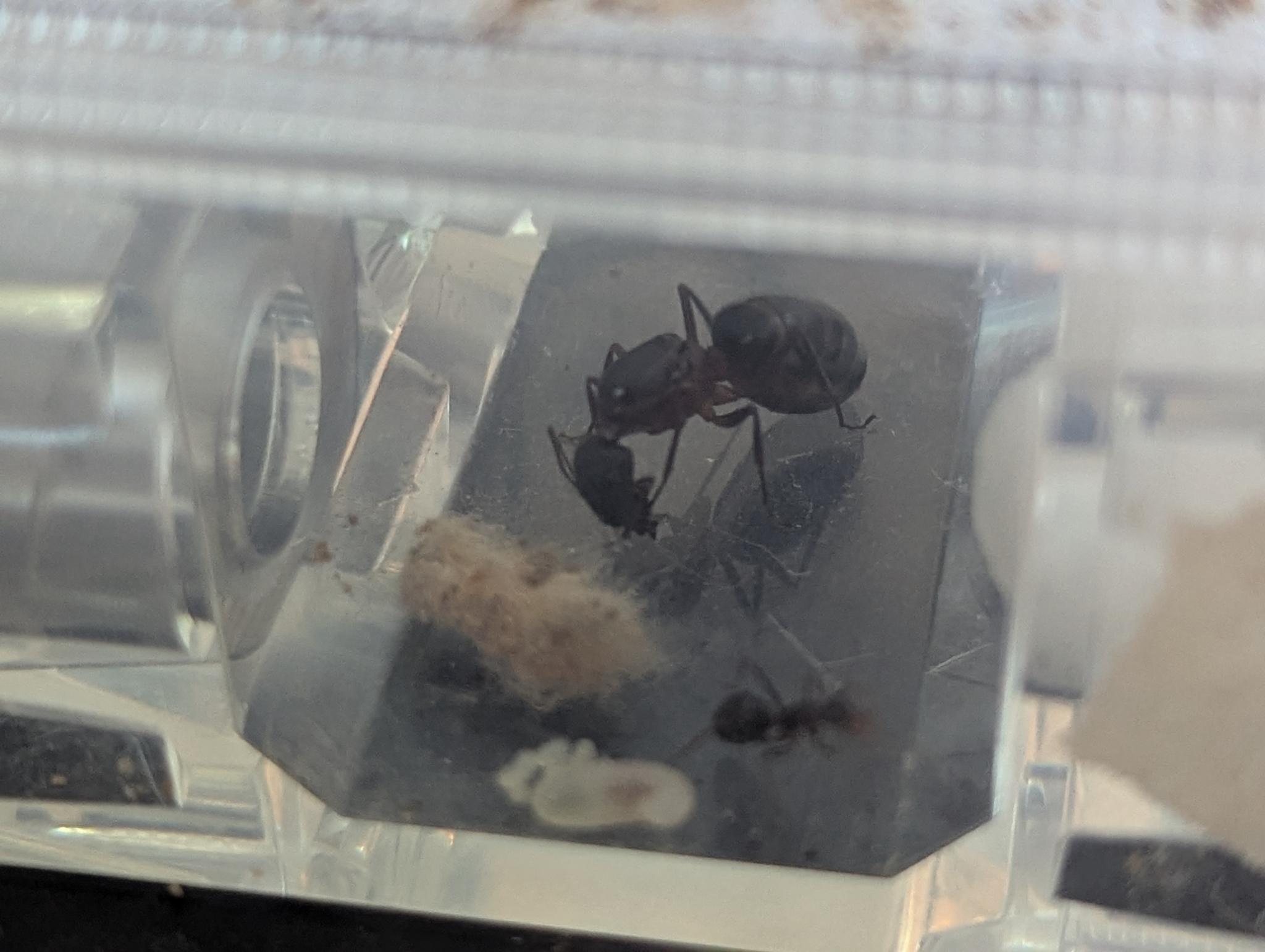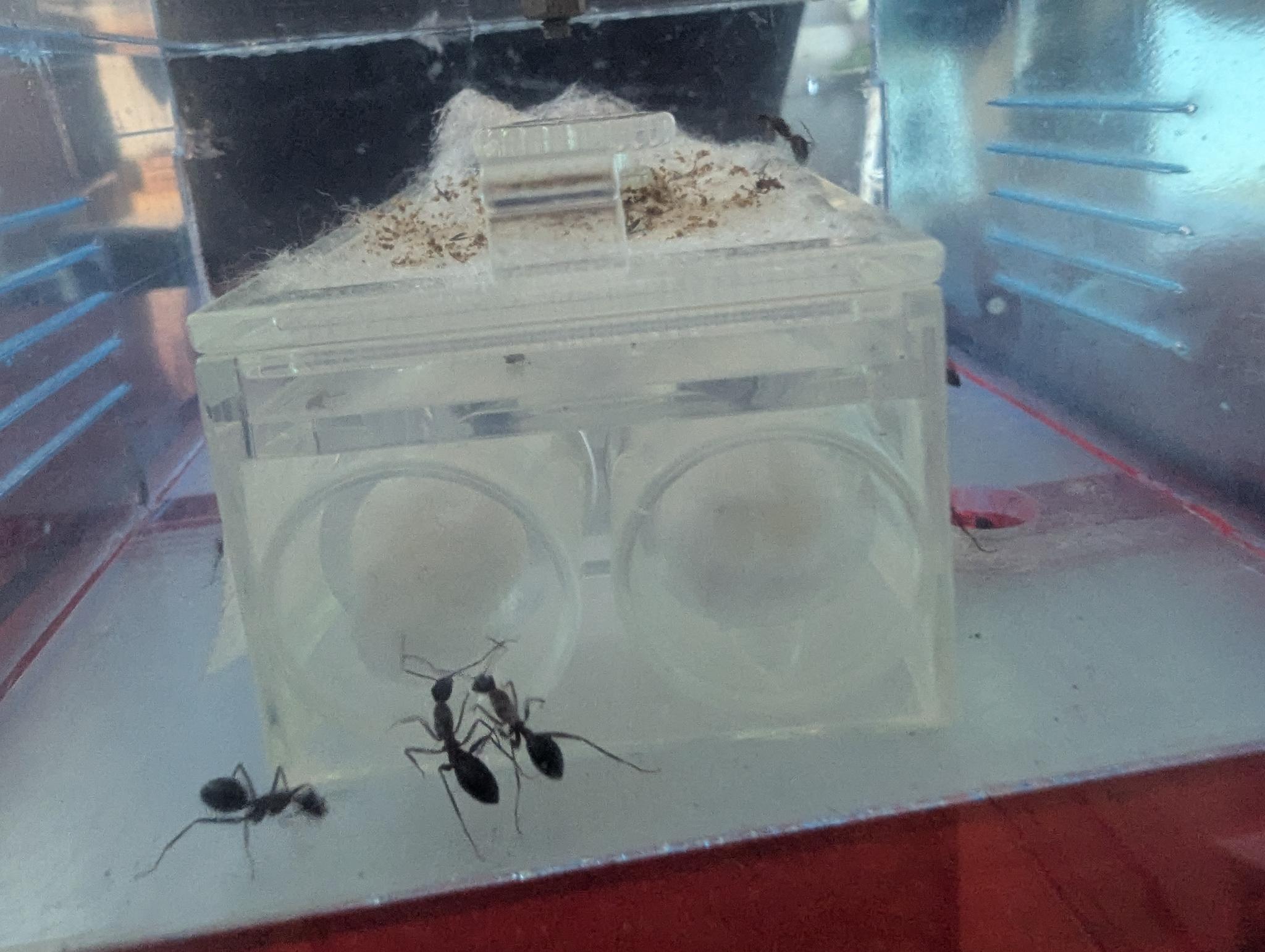 Kurzes update. Ich habe das kleine Nest noch mal angepasst und zwei der Eingänge mit einem Stoff/Plastikgitter verschlossen, damit sich der Geruch besser verteilen kann. Ausserdem habe ich auf der anderen Seite einfach direkt Watte reingestopft und die eine mit Wasser und die andere mit Zuckerwasser getränkt. Ebenfalls habe ich der Königin Drosophila angeboten, welche sie tatsächlich direkt gemampft hat.