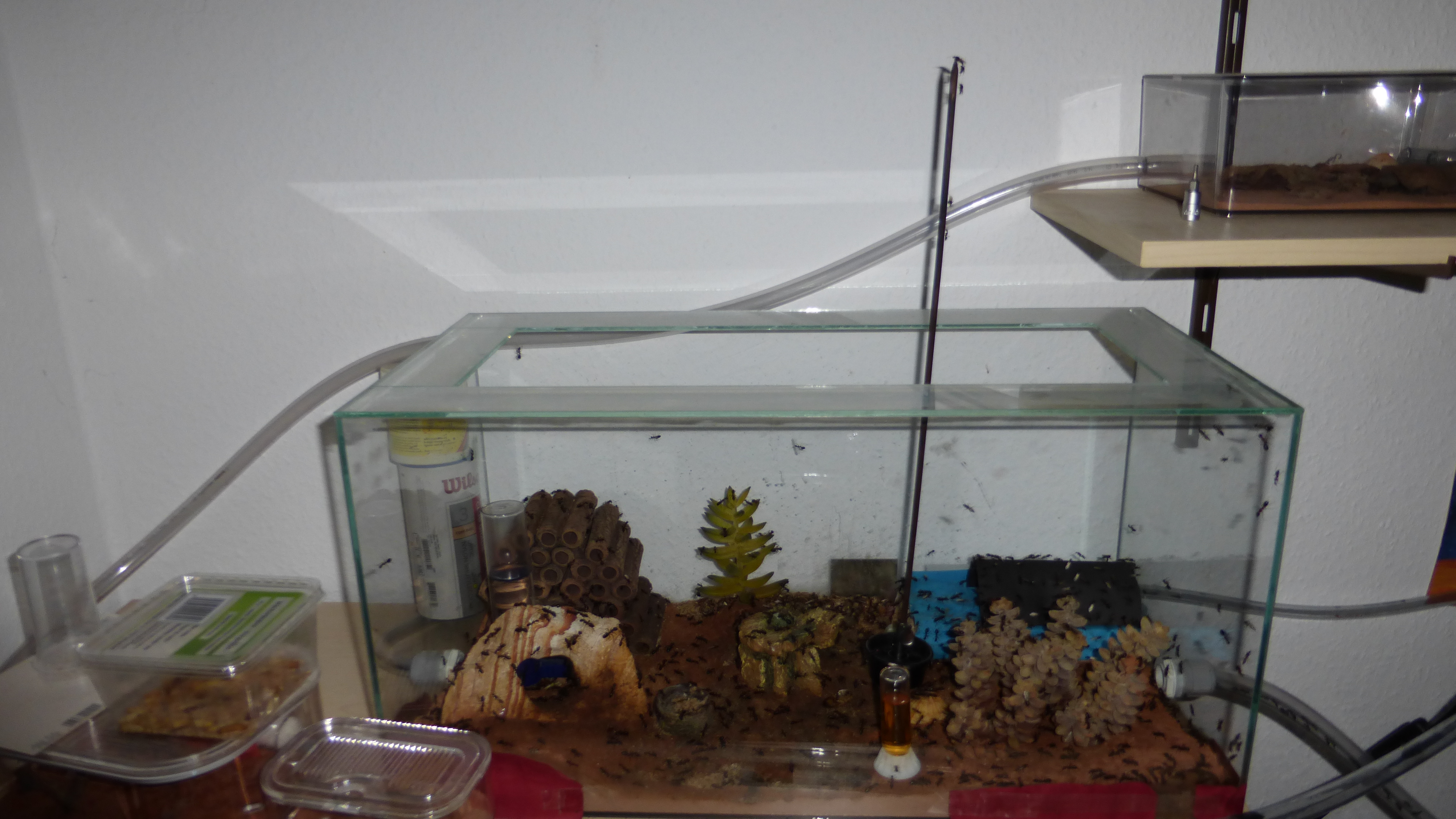 Und ja, ich hab ihnen eine Startstange zur Verfügung gestellt, denn ich hab keine Lust in das Becken zu langen und die Männchen aus einer Horde extrem aufgeregter Ameisen rauszusammeln - anderseits möchte ich aber auch nicht, dass sie mir bei jedem Flugversuch die massenhaft die Scheiben hochklettern und eventuell die Barriere durchbrechen. Es ist deutlich einfach sie von der Wand und der Fensterscheibe zu sammeln - die gehen eh zum Licht, ist recht einfach alle zu erwischen. Das einzig doofe ist, dass es bedeutet, dass das Fenster zubleiben muss und das im Hochsommer. Aber irgendwas ist ja immer, zum Glück mag ich's warm. :D